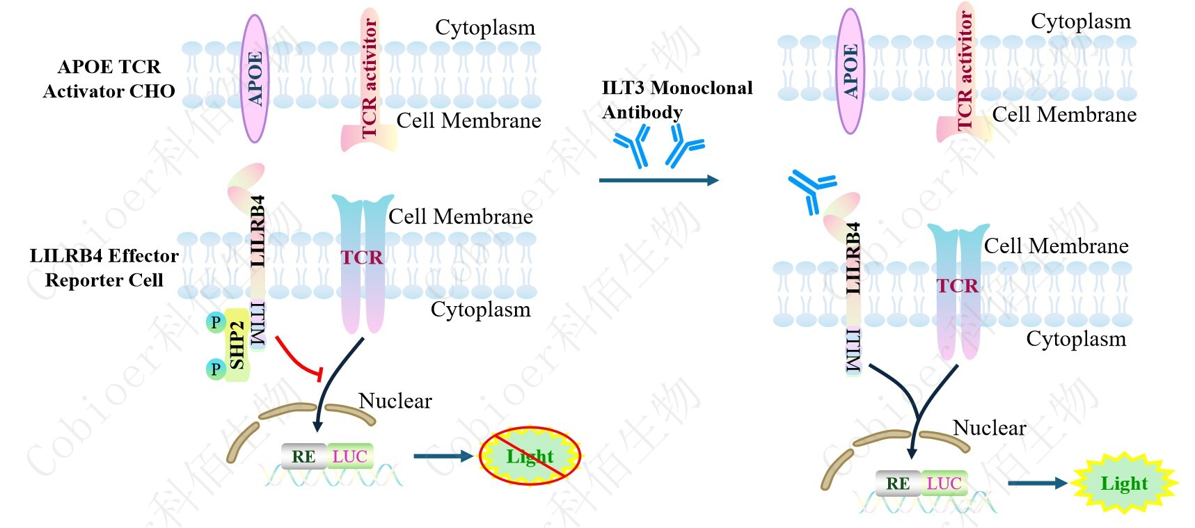 APOE TCR Activator CHO 作為 LILRB4 Effector Reporter Cell 的靶細(xì)胞,很好的模擬了 體內(nèi) LILRB4 的信號轉(zhuǎn)導(dǎo)過程,原理見下圖所示。![]() Figure 1. APOE TCR Activator CHO 模型原理圖 |