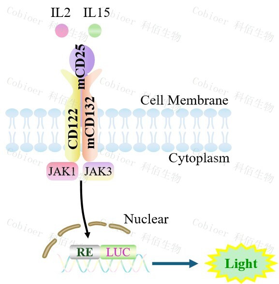 Figure 1. hIL2/IL15(mCD25 hCD122 mCD132)Effector Reporter Cell 細(xì)胞模型原理圖 |