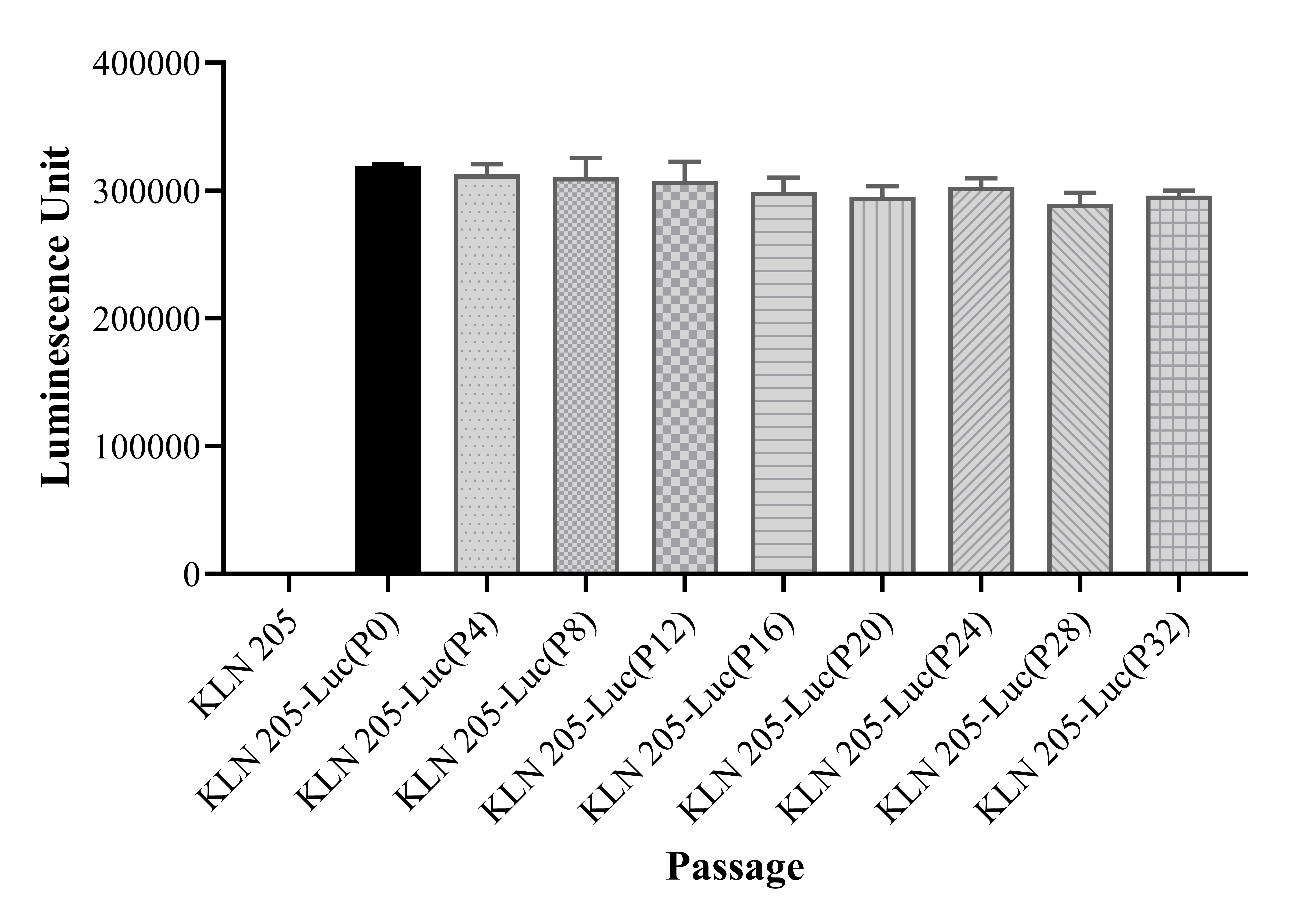 ![]() Figure 1. Stablity test results. KLN205-Luc cells showed at least 32 passage stability with similar luminescence unit. |