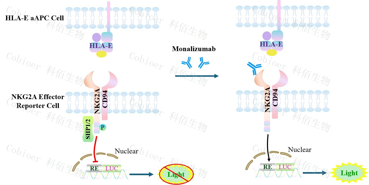 HLA-E aAPC Cell 作為 NKG2A Effector Reporter Cell 的靶細(xì)胞,很好的模擬了體內(nèi) NKG2A &HLA-E 的信號(hào)轉(zhuǎn)導(dǎo)過程,原理見下圖所示。 ![]() Figure 1. HLA-E aAPC Cell 細(xì)胞模型原理圖 |
