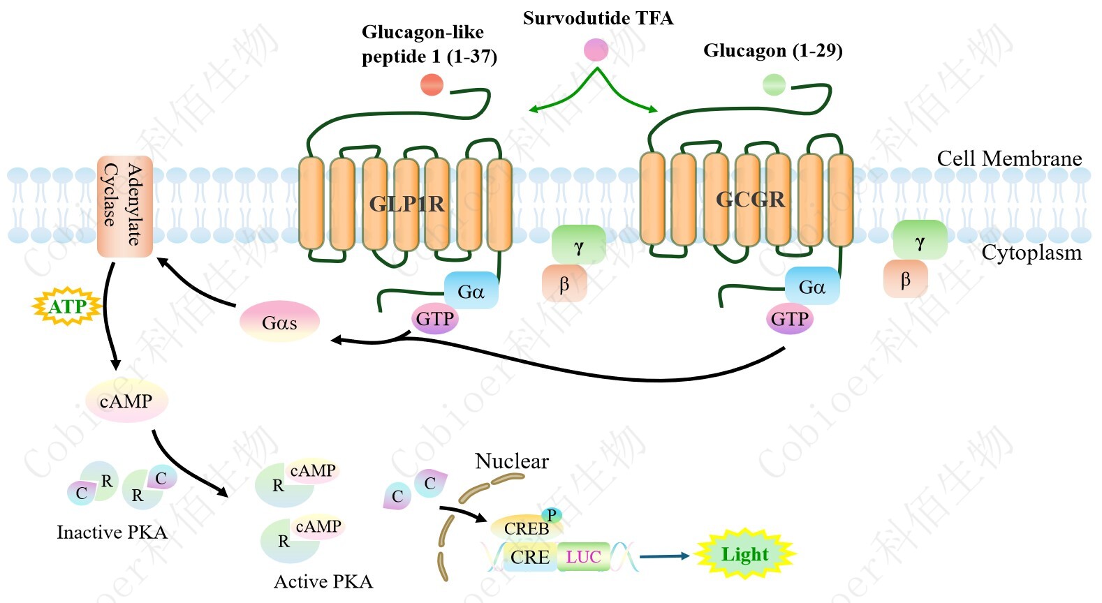 GLP1R&GCGR Dual Reporter Cell 報(bào)告基因藥靶模型很好的模擬了體內(nèi) GLP1R&GCGR 的信號轉(zhuǎn)導(dǎo)過程,原理見圖 1 所示。