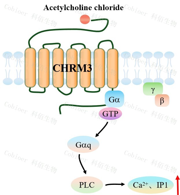 | CHRM3(Cholinergic Receptor Muscarinic 3)是毒蕈堿型乙酰膽堿受體(mAChRs)家 族的重要成員,屬于 GPCR,主要分布于外周組織(如 平滑肌、外分泌腺)及部分中樞區(qū) 域(如下丘腦),通過介導(dǎo)乙酰膽堿(ACh)信號調(diào)控平滑肌收縮、腺體分泌及能量代謝。 ACh 結(jié)合 CHRM3 后,激活 Gq/11 蛋白,啟動(dòng) PLCβ信號通路,水解 PIP2 生成 IP3 和 DAG, 觸發(fā)細(xì)胞內(nèi)鈣離子釋放,激活蛋白激酶 C(PKC);通過β-arrestin 通路調(diào)控 ERK 磷酸化, 影響細(xì)胞增殖與炎癥反應(yīng)。 | |