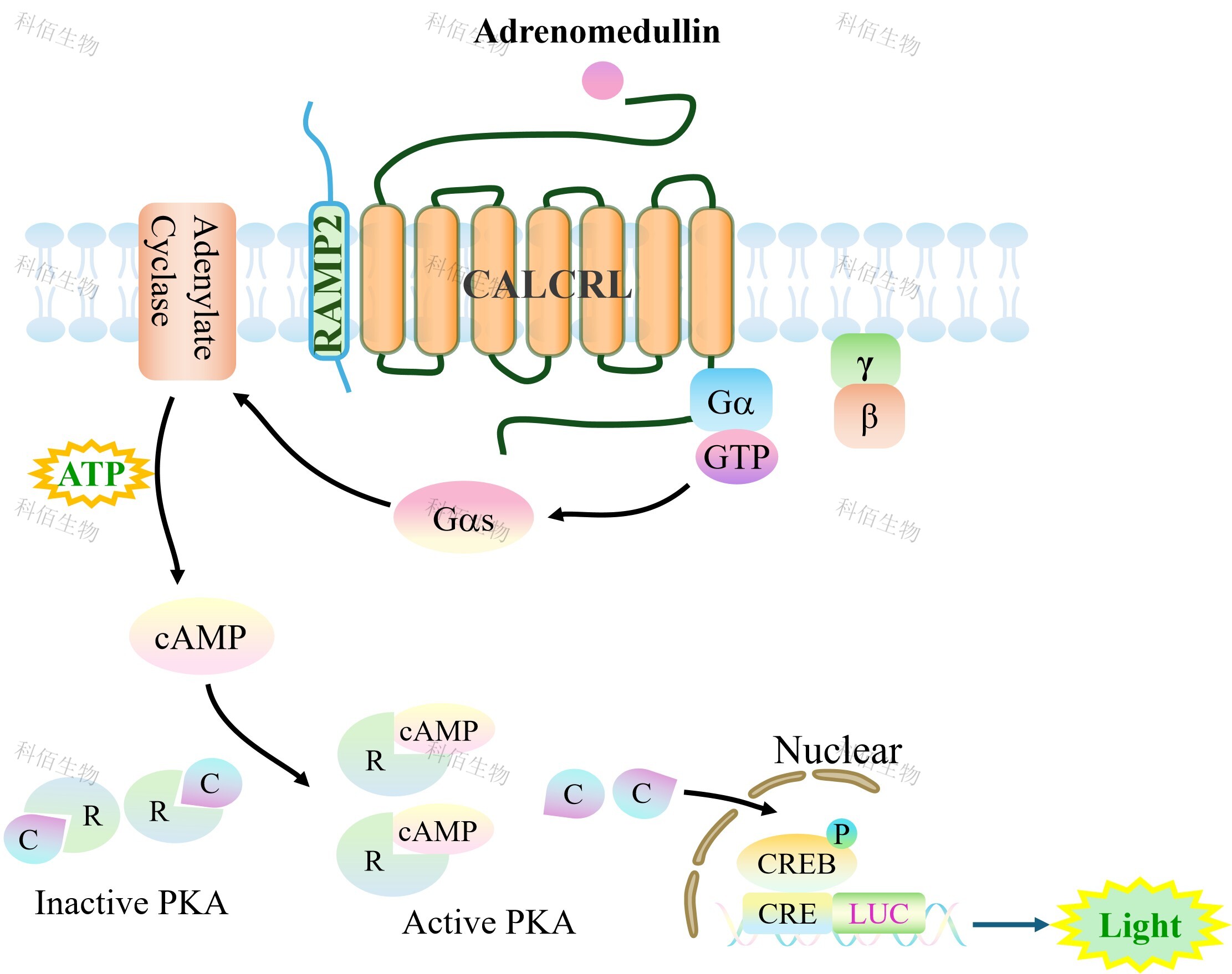 CALCRL&RAMP2 CRE-Luc HEK293 報告基因靶模型很好的模擬了體內(nèi) Adrenomedullin 的信號轉(zhuǎn)導(dǎo)過程,原理見下圖所示。