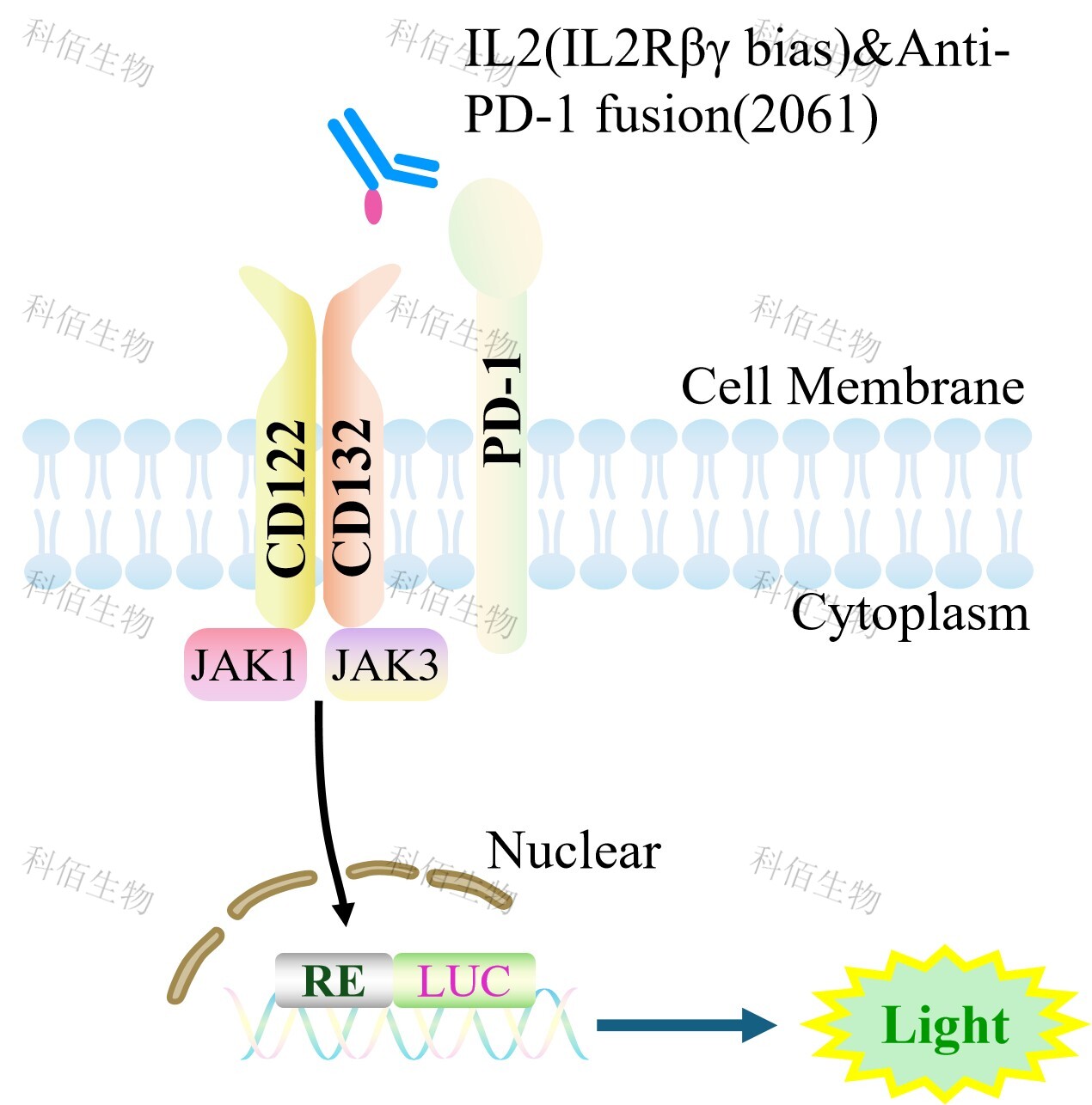PD-1&IL2/IL15(hCD122/hCD132) Effector Reporter Cell 報告基因藥靶模型很好的模擬 了體內(nèi) PD-1&IL2 受體二亞基的信號轉(zhuǎn)導(dǎo)過程,原理見下圖所示。![]() Figure 1. PD-1&IL2/IL15(hCD122/hCD132) Effector Reporter Cell 細(xì)胞模型原理圖 |