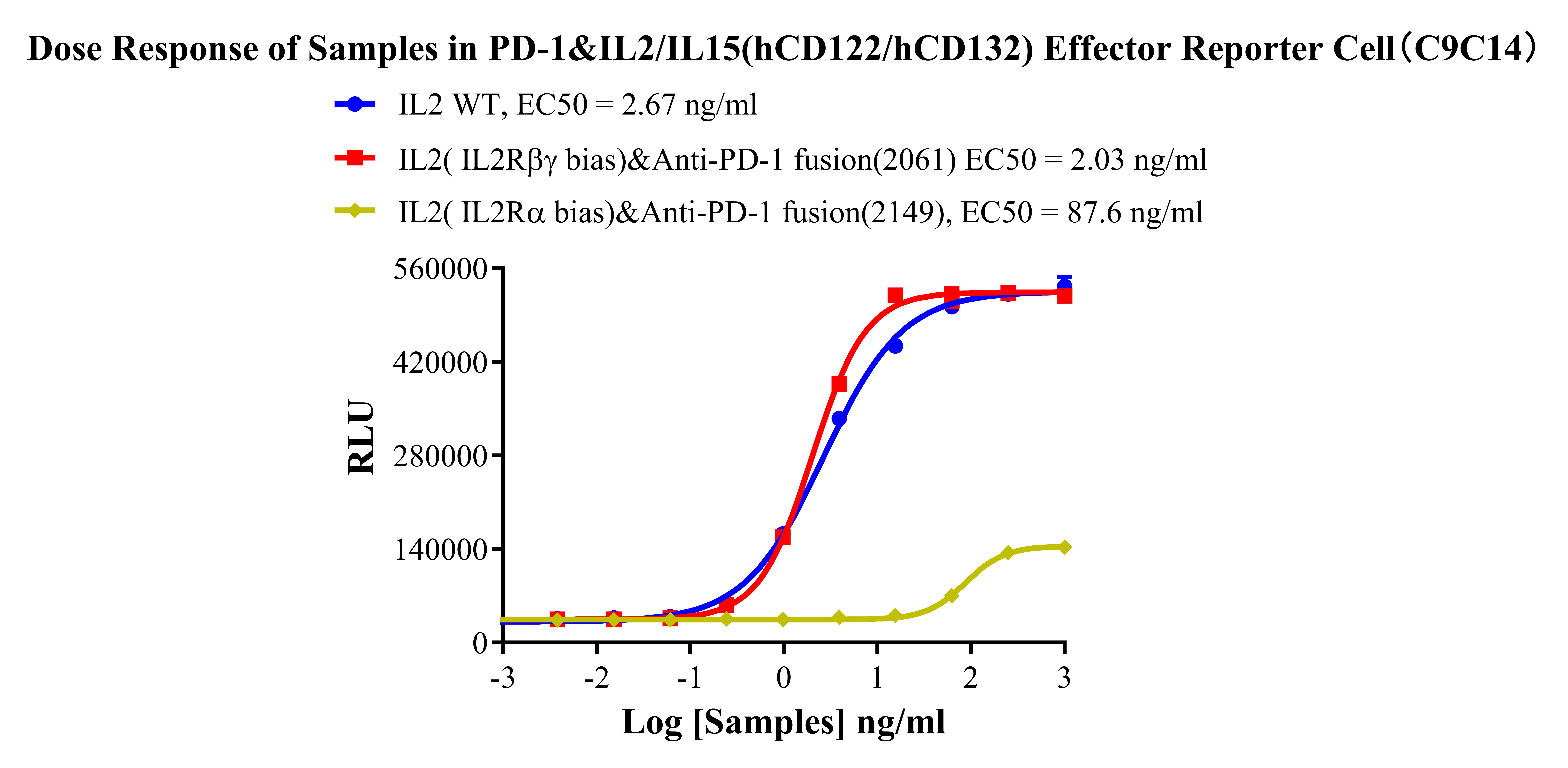 ![]() Figure 4. Dose Response of IL2 (IL2Rβγ bias)&Anti-PD-1 Fusion in PD-1&IL2/IL15(hCD122/hCD132 Effector Reporter Cell(C9C14) vs IL2/IL15(hCD122/hCD132) Effector Reporter Cell(C9). |
