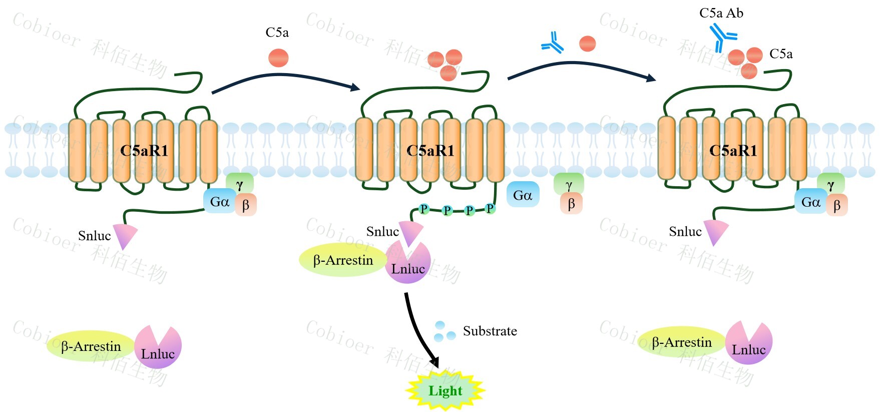 C5aR1 β-Arrestin CHO 報告基因藥靶模型很好的模擬了體內(nèi) C5aR1/β-Arrestin 的信號轉(zhuǎn)導(dǎo)過程,原理見下圖所示。![]() Figure 1. C5aR1 β-Arrestin CHO 細(xì)胞模型原理圖 |
