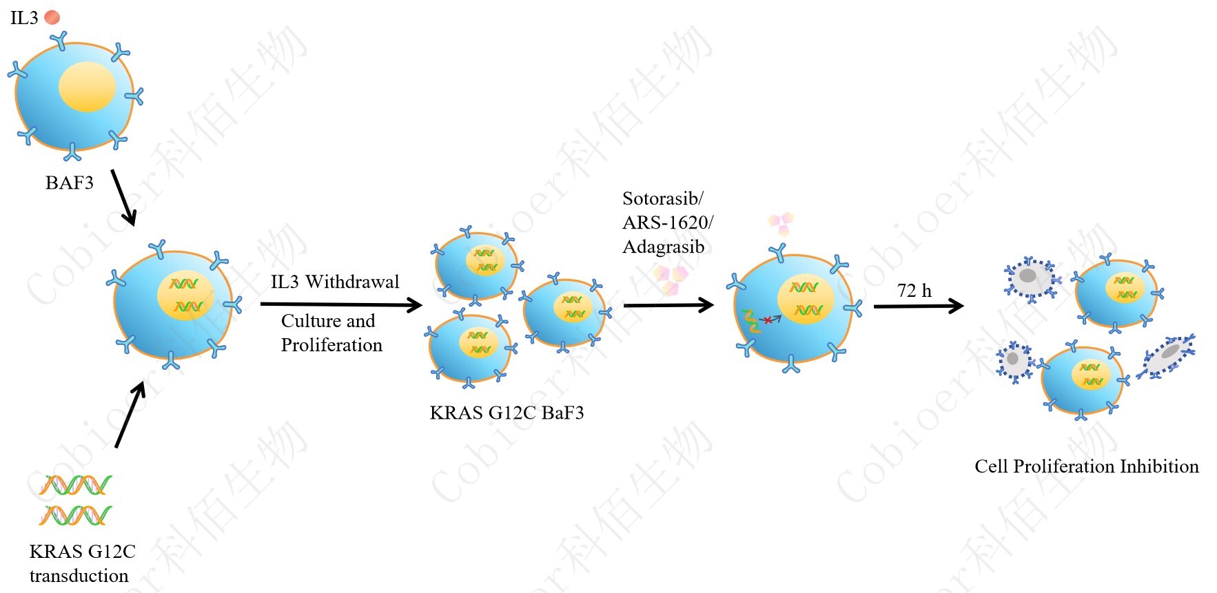 BaF3(小鼠原 B 細胞)的生長和增殖需要 IL-3 的維持。通過引入各種表達激酶的基因, 能作為 BaF3 的驅(qū)動基因,讓 BaF3 不再依賴 IL-3 而增殖,進而激酶基因成為 BaF3 增殖依賴的驅(qū)動基因,用于評估小分子藥物對激酶的靶向抑制作用,原理及流程見下圖所示。