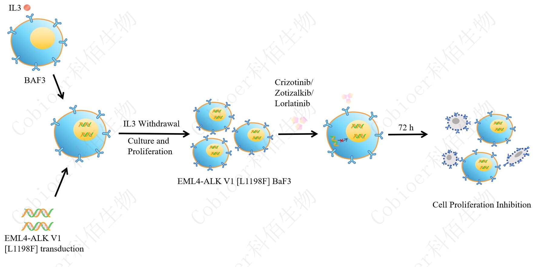 BaF3(小鼠原 B 細(xì)胞)的生長和增殖需要 IL-3 的維持。通過引入各種表達(dá)激酶的基因, 能作為 BaF3 的驅(qū)動基因,讓 BaF3 不再依賴 IL-3 而增殖,進而激酶基因成為 BaF3 增殖依 賴的驅(qū)動基因,用于評估小分子藥物對激酶的靶向抑制作用,原理及流程見下圖所示。