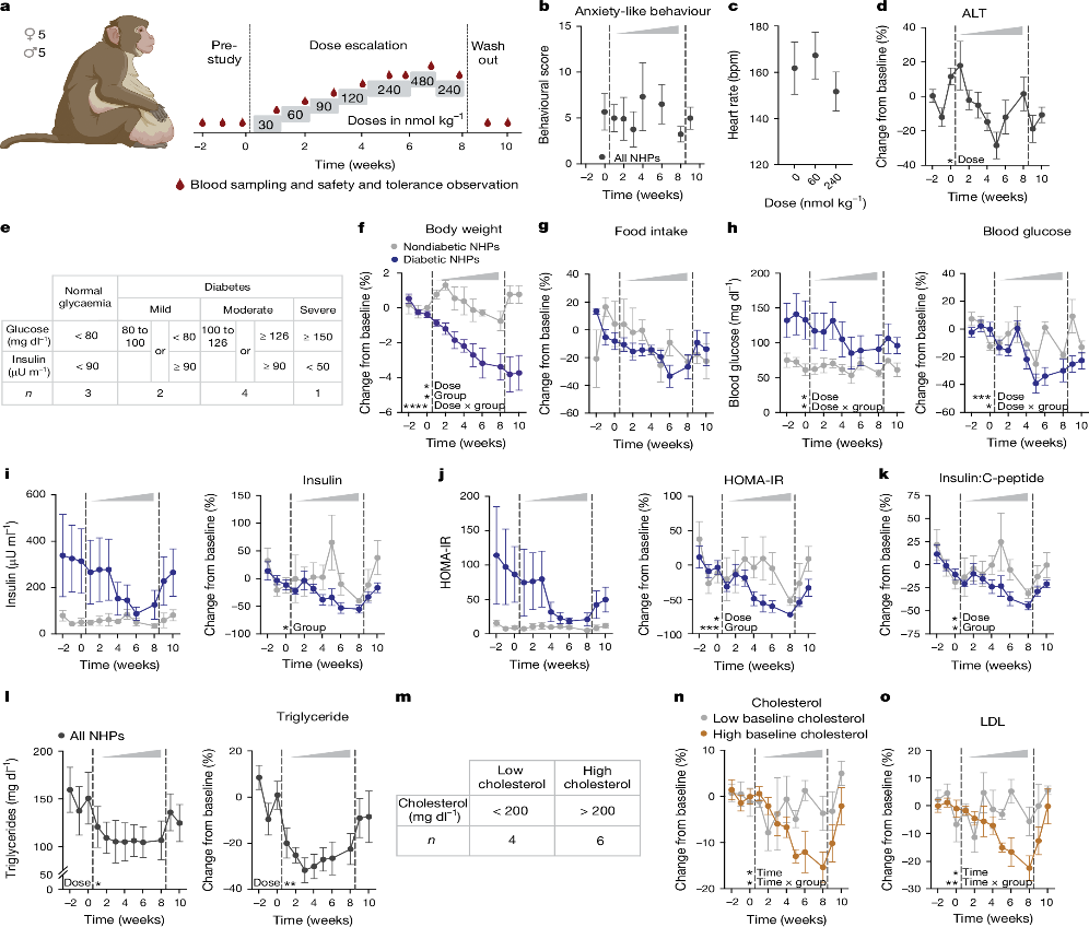 在患有心臟代謝疾病的肥胖的恒河猴中,NK2R激動劑顯著降低了體重、血糖、甘油三酯和膽固醇水平,并改善了胰島素抵抗,這些結果表明NK2R激動劑在非人靈長類動物中也具有潛在的治療潛力。