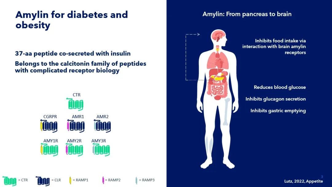 胰淀素(Amylin)是胰島β細(xì)胞分泌的"智能激素",和胰島素是好搭檔。胰淀素要發(fā)揮作用,必須找到它的專屬"接收器"——胰淀素受體(AMYR)。該受體由降鈣素受體(CTR)與受體活性修飾蛋白(RAMP1、RAMP1和 RAMP3)異源二聚化形成。