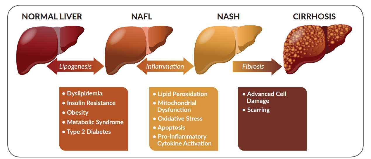 非酒精性脂肪性肝炎(NASH)是非酒精性脂肪肝?。∟AFLD)的嚴(yán)重形式,伴隨肝臟炎癥、脂肪堆積和纖維化,可進(jìn)展為肝硬化甚至肝癌。全球約 25% 成人患有非酒精性脂肪肝?。∟AFLD),其中20%-30% 會進(jìn)展為非酒精性脂肪性肝炎(NASH)。