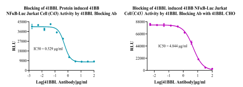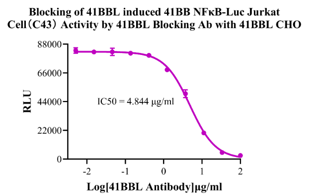 Figure 10. Blocking of 41BBL Protein induced 41BB NFκB-Luc Jurkat Cell (C43) Activity by 41BBL Blocking Ab. Blocking of 41BBL induced 41BB NFκB-Luc Jurkat Cell(C43) Activity by 41BBL Blocking Ab with 41BBL CHO.