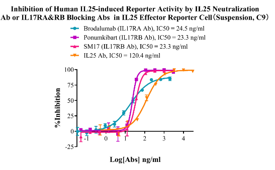 Figure 6. Inhibition of Human IL25-induced Reporter Activity by IL25 Neutralization Ab or IL17RA&RB Blocking Abs in IL25 Effector Reporter Cell (Suspension, C9).