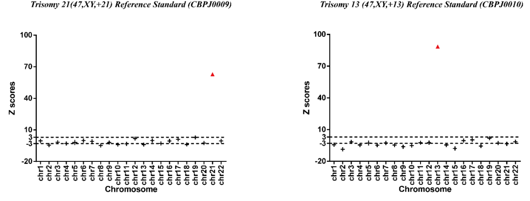 Fig 1. Results of NGS with Trisomy 21 (47,XY,+21) Reference Standard and Trisomy 13 (47,XY,+13) Reference Standard.