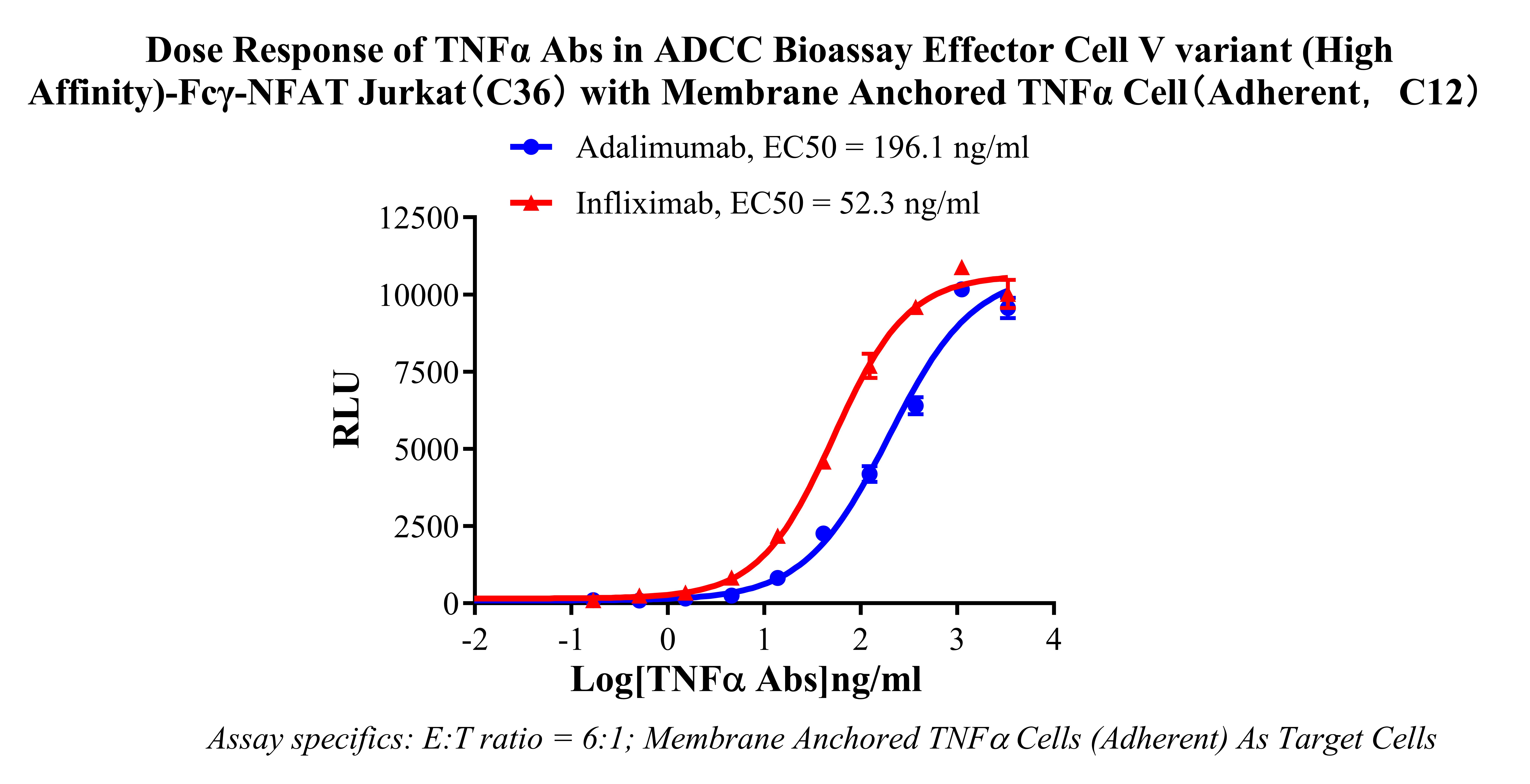 Figure 2. Dose Response of TNFα Abs in ADCC Bioassay Effector Cell V variant (High Affinity)-Fcγ-NFAT-Jurkat (C36) with Membrane Anchored TNFα Cell (Adherent, C12).