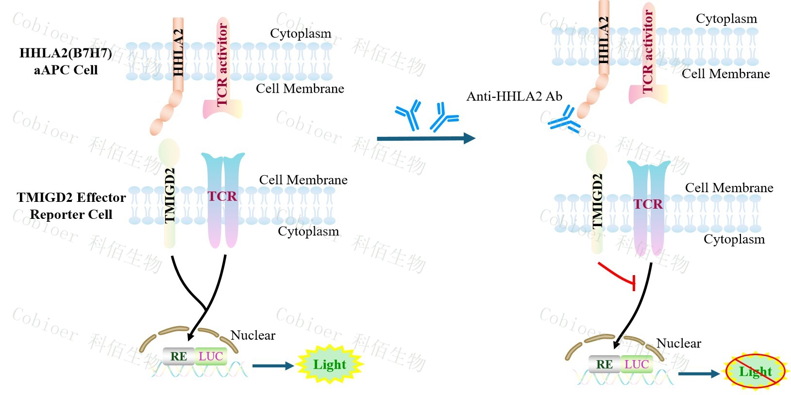 TMIGD2 Effector Reporter Cell 報(bào)告基因藥靶模型很好的模擬了體內(nèi) TMIGD2 的信號(hào)轉(zhuǎn) 導(dǎo)過(guò)程,原理見(jiàn)下圖所示。![]() Figure 1. TMIGD2 Effector Reporter Cell 模型原理圖 |