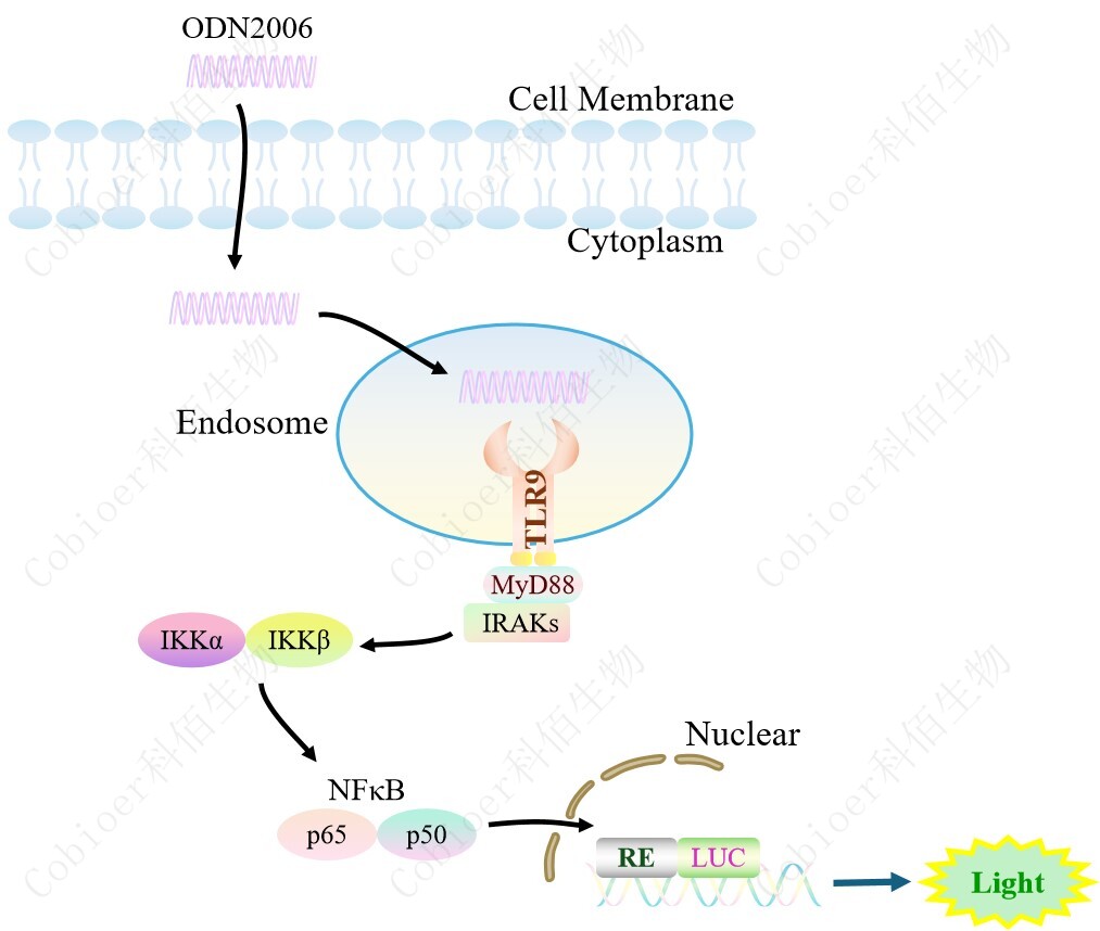 TLR9 NFκB-Luc HEK293 報(bào)告基因藥靶模型很好的模擬了體內(nèi) TLR9 的信號轉(zhuǎn)導(dǎo)過程, 原理見下圖所示。