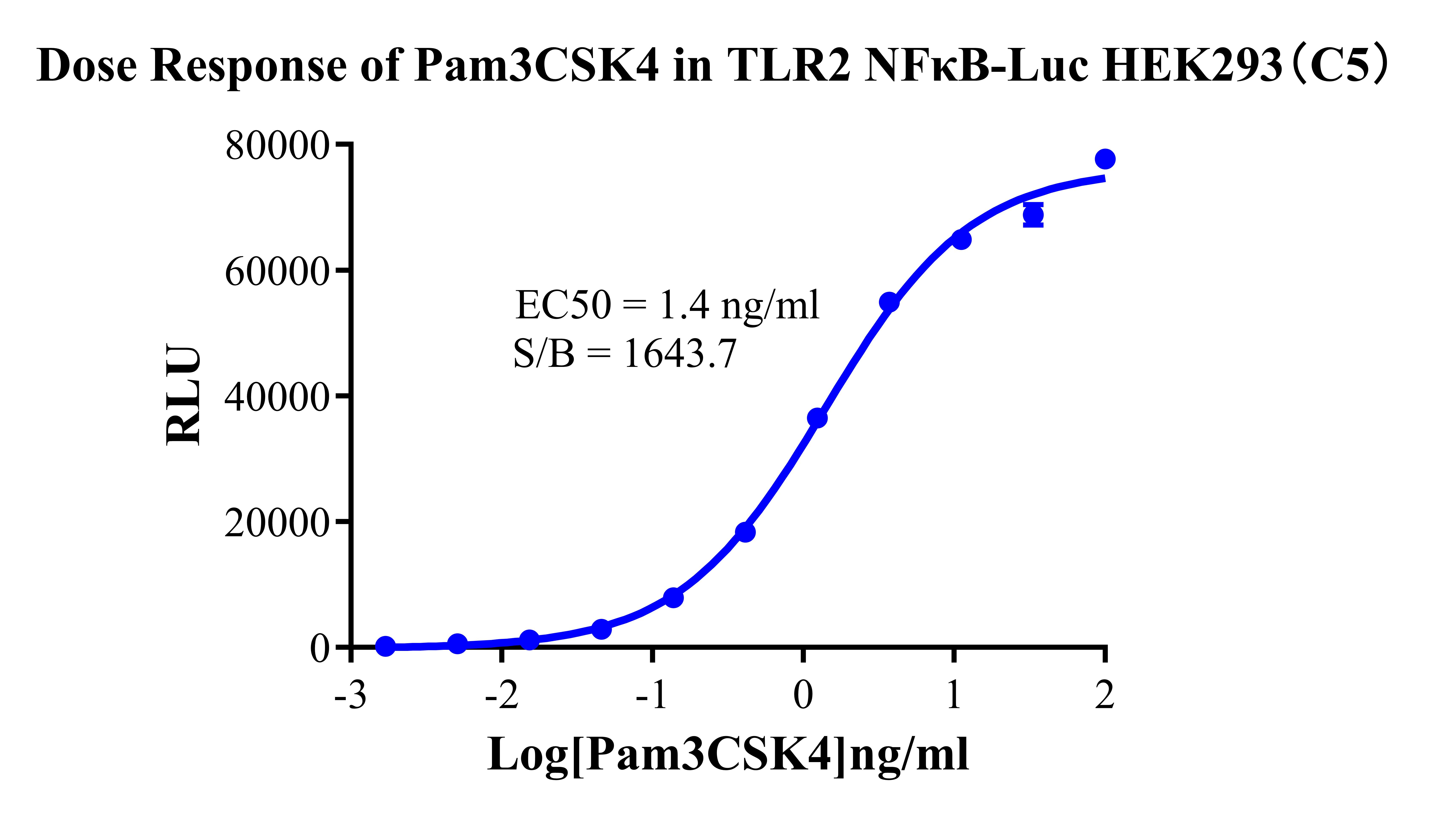 Figure 2.Detect Luciferase assay by Ultra Luciferase Detection Kit CBPH0001(we strongly suggest to purchase from Cobioer). Dose Response of Pam3CSK4 in TLR2 NFκB-Luc HEK293(C5).