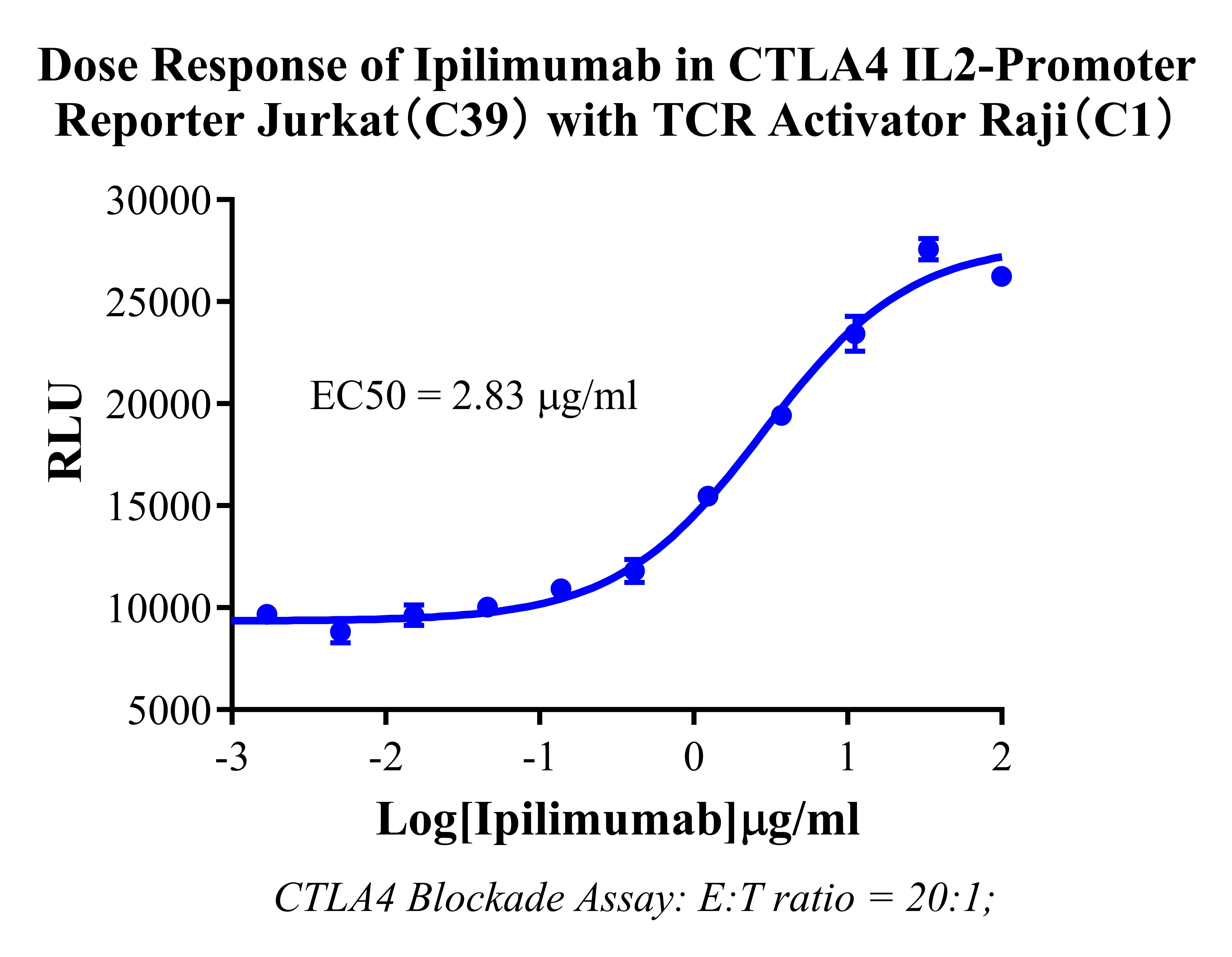 Figure 5. Dose Response of Ipilimumab in CTLA4 IL-2 Promoter Reporter-Jurkat (C39)with TCR Activitor Raji (C1).