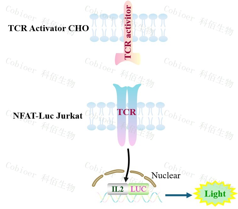 TCR Activator CHO 報告基因藥靶模型很好的模擬了體內(nèi) TCR 的信號轉(zhuǎn)導(dǎo)過程,原理見下圖所示。