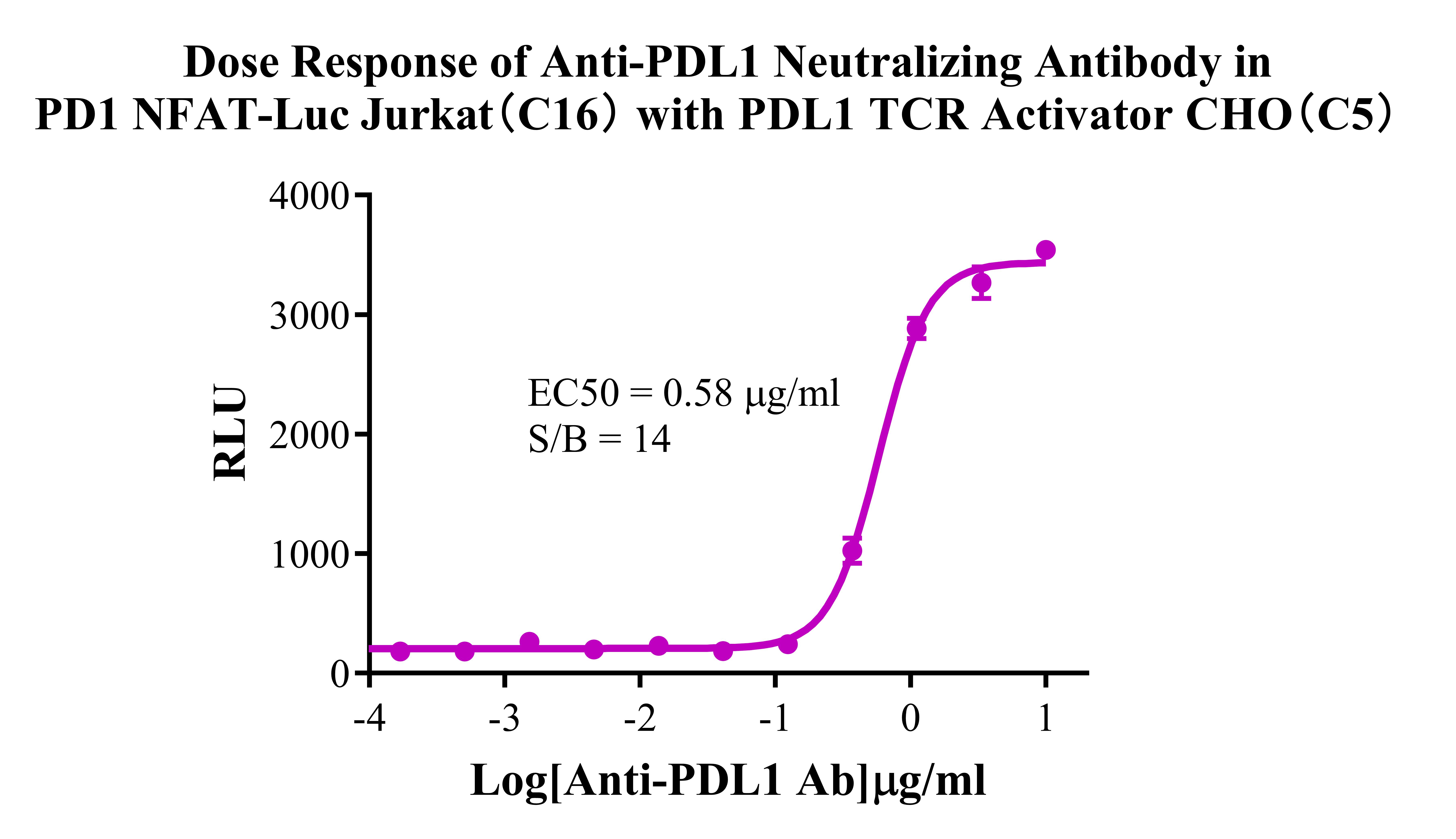 Figure 4. Detect Luciferase assay by Ultra Luciferase Detection Kit CBPH0001(we strongly suggest to purchase from Cobioer). Dose response of Anti-PDL1 Neutralizing Antibody in PD1 NFAT-Luc Jurkat(C16) with PDL1 TCR Activator CHO (C5).