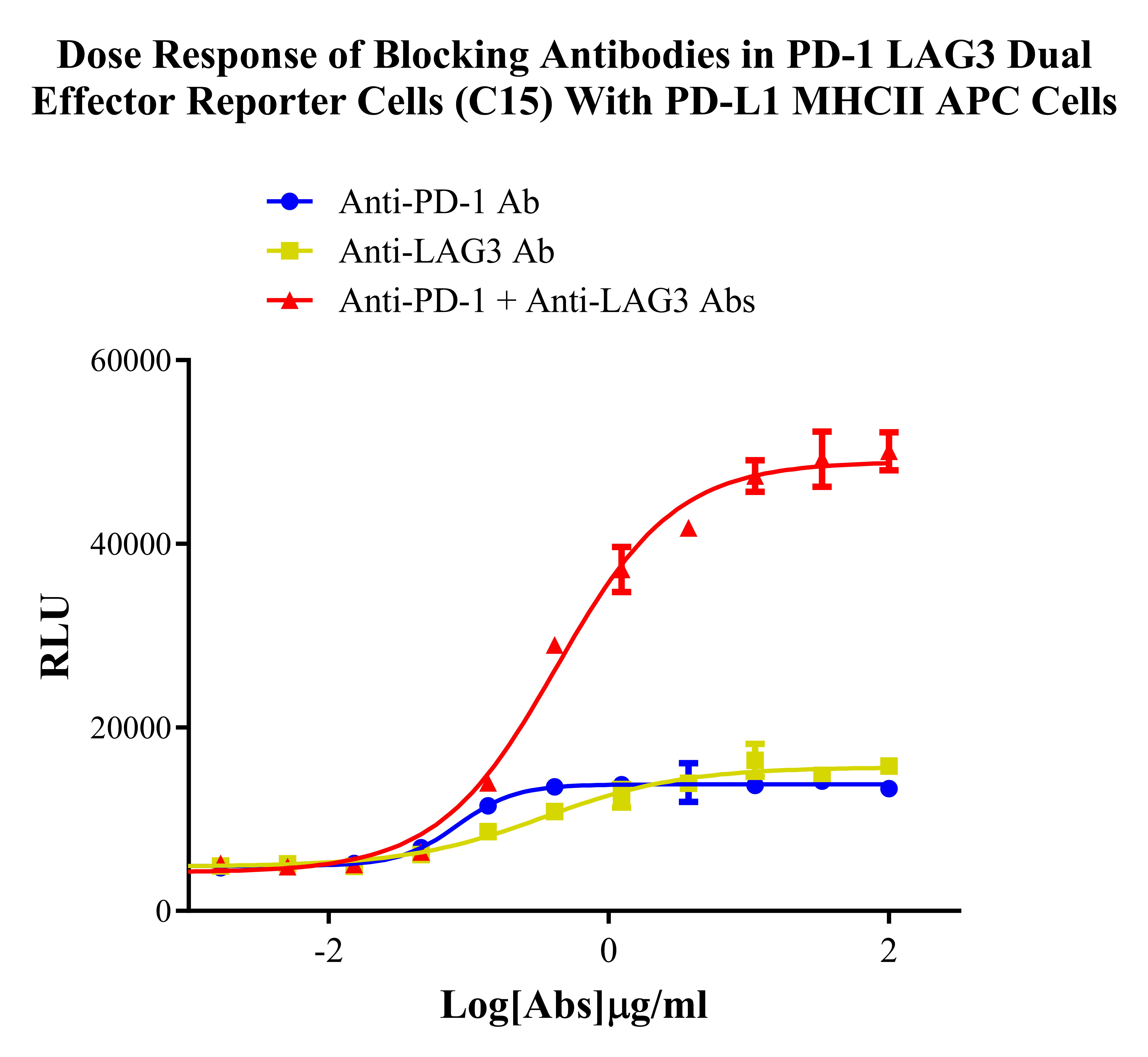 Figure 3. Dose Response of Blocking Antibodies in PD-1 LAG3 Dual Effector Reporter Cells (C15) With PD-L1 MHCII APC Cells.