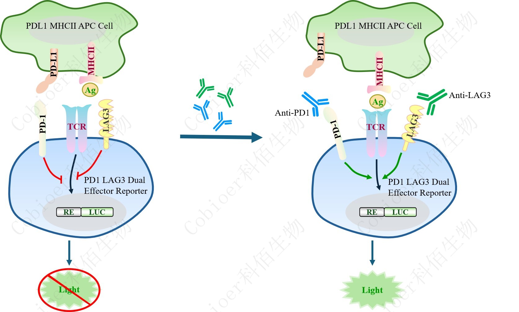 PD1 LAG3 Dual Effector Reporter Cell 報告基因藥靶模型很好的模擬了體內(nèi) PD1&LAG3 的信號轉(zhuǎn)導(dǎo)過程,原理見下圖所示。![]() Figure 1. PD1 LAG3 Dual Effector Reporter Cell 細胞模型原理圖 |