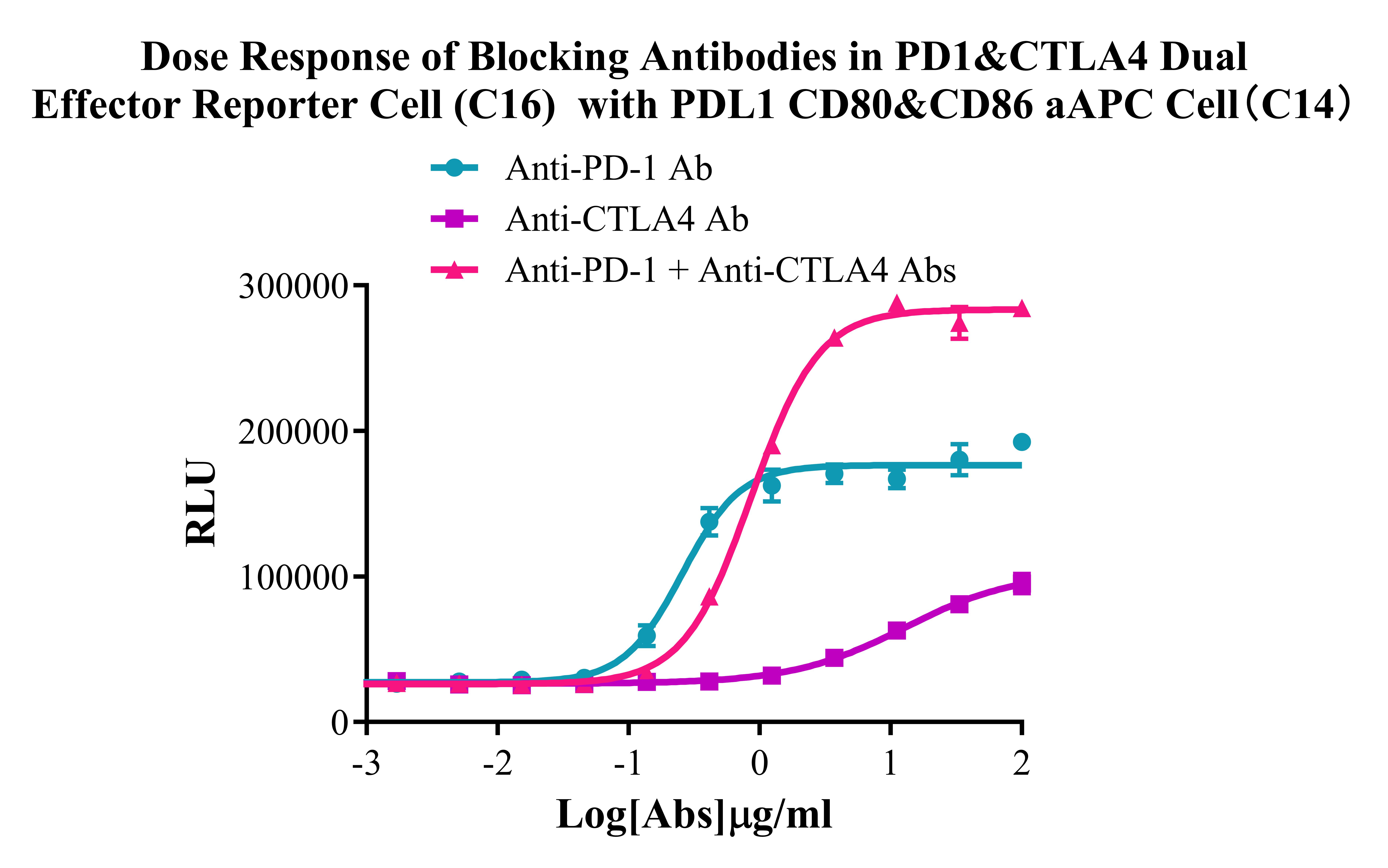 Figure 2. Dose Response of Blocking Antibodies in PD1&CTLA4 Dual Effector Reporter Cell (C16) With PD-L1 CD80&CD86 aAPC Cell (C14).