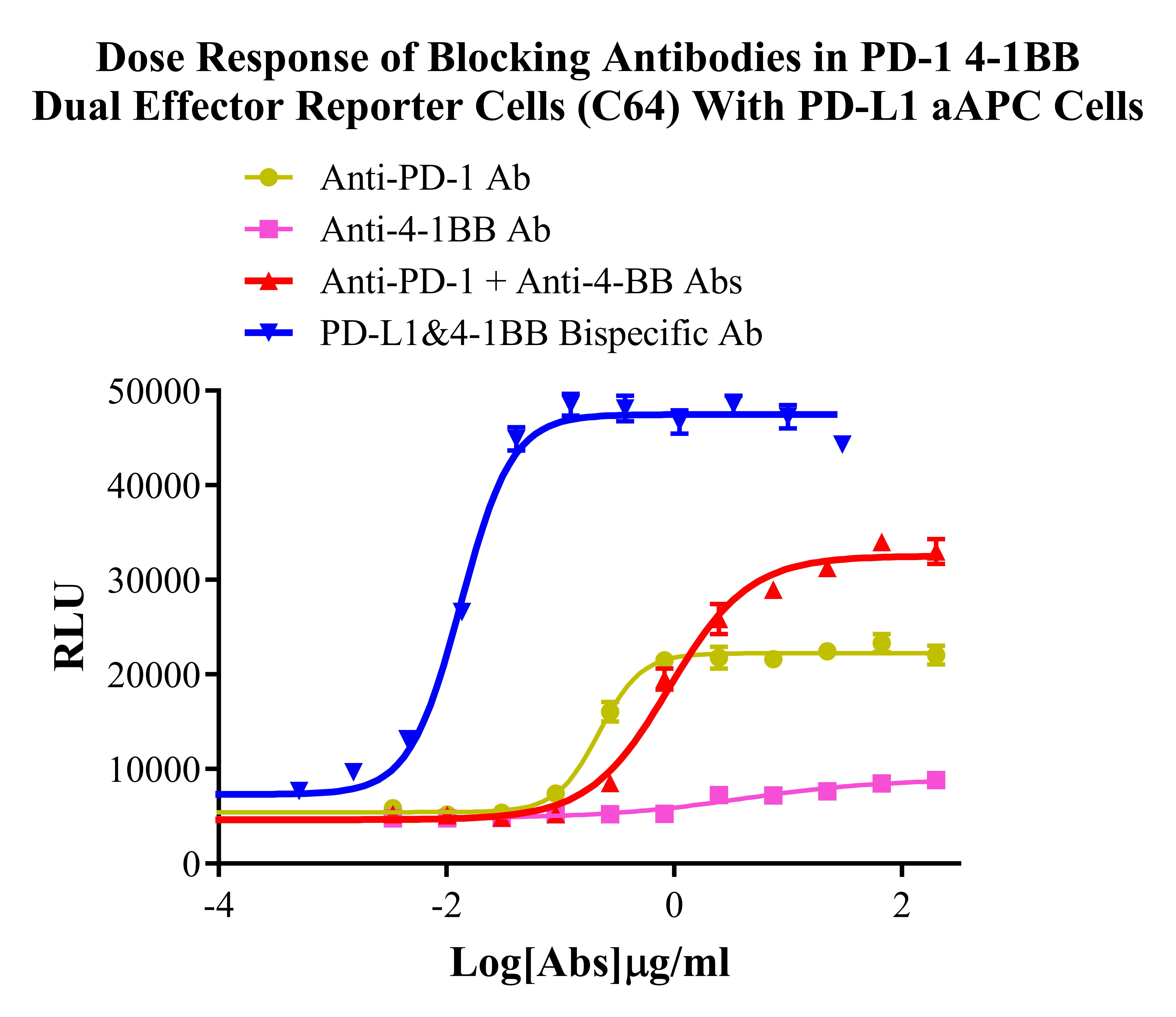 Figure 3. Dose Response of Blocking Antibodies in PD-1 4-1BB Dual Effector Reporter Cells (C64) With PD-L1 aAPC Cells.