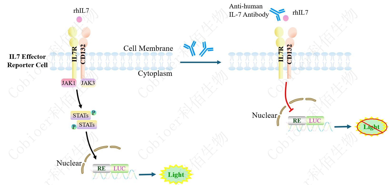 IL7 Effector Reporter Cell 報(bào)告基因藥靶模型很好的模擬了體內(nèi) IL7 的信號(hào)轉(zhuǎn)導(dǎo)過(guò)程,原理見(jiàn)下圖所示。![]() Figure 1. IL7 Effector Reporter Cell 模型原理圖 |