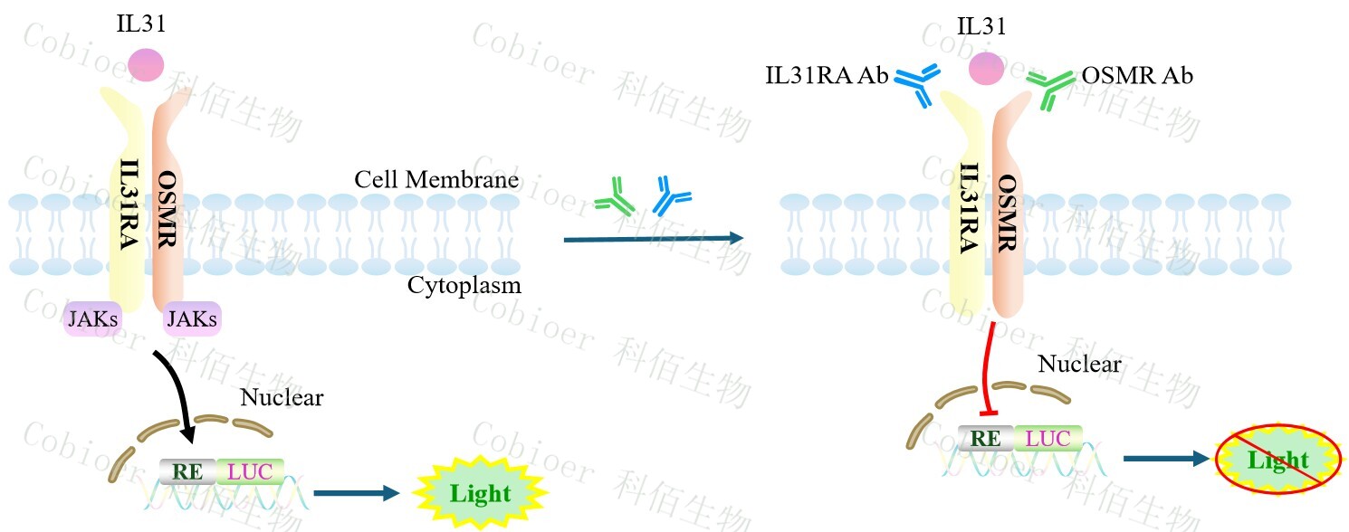 IL31 Effector Reporter報告基因藥靶模型很好的模擬了體內(nèi) IL31的信號轉(zhuǎn)導過程,原理見下圖所示。![]() Figure 1. IL31 Effector Reporter Cell 細胞模型原理圖