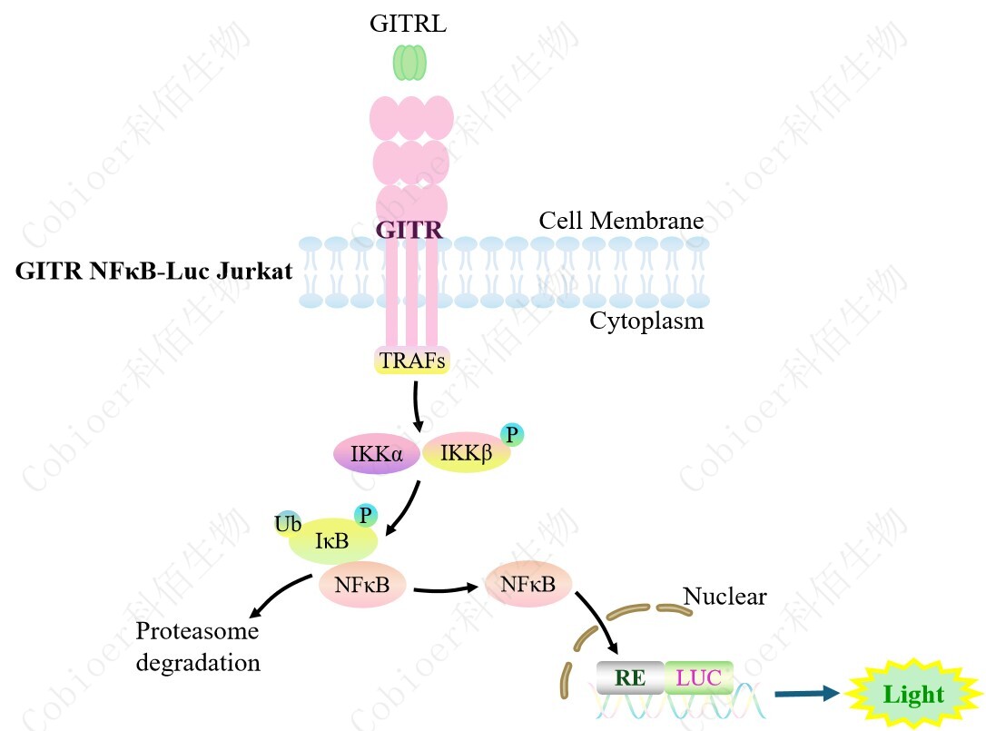 GITR NFκB-Luc Jurkat 報告基因藥靶模型很好的模擬了體內(nèi) GITR 的信號轉(zhuǎn)導(dǎo)過程, 原理見下圖所示。![]() Figure 1. GITR NFκB-Luc Jurkat 細胞模型原理圖