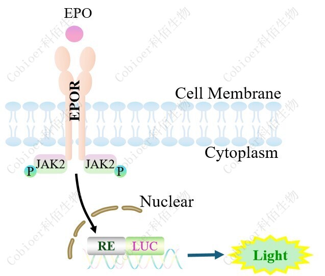 EPO Effector Reporter Cell 報告基因藥靶模型很好的模擬了體內(nèi) EPO&EPOR 的信號轉(zhuǎn) 導(dǎo)過程,原理見下圖所示。![]() Figure 1. EPO Effector Reporter Cell 細胞模型原理圖 |