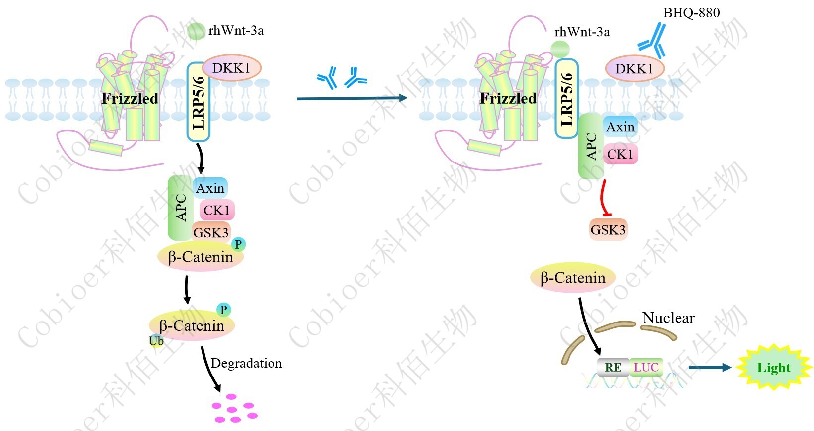 | Wnt 信號(hào)通路是一種進(jìn)化保守的通路,控制發(fā)育的多個(gè)方面,包括成人發(fā)育過程中的 細(xì)胞增殖、細(xì)胞凋亡、細(xì)胞遷移和細(xì)胞極性以及干細(xì)胞維持。 低密度脂蛋白(LDL)受體相關(guān)蛋白 5/6(LRP5/6)是單層跨膜糖蛋白,是典型 Wnt 信號(hào) 通路的重要共受體。LRP5/6 有由四個(gè)重復(fù)單元(E1,E2,E3 和 E4)組成的細(xì)胞外結(jié)構(gòu)域 (ECD),且 ECD 是 Wnt 信號(hào)傳導(dǎo)的重要調(diào)控位點(diǎn),為 Wnt 配體提供了至少兩個(gè)獨(dú)立的結(jié)合 位點(diǎn)。典型 Wnt 信號(hào)通路的激活發(fā)生在 Wnt 配體與其共受體 LRP5/6 結(jié)合,然后與卷曲受 體(FZD)形成復(fù)合物。Wnt-FZD-LRP5/6 復(fù)合體的形成,Axin 介導(dǎo)的破壞復(fù)合體就會(huì)通過被 破壞復(fù)合體內(nèi)的其他蛋白質(zhì)磷酸化而轉(zhuǎn)運(yùn)到質(zhì)膜上,從而抑制 b-catenin 的磷酸化。該破壞 復(fù)合體由 Axin、APC、CK1 和 GSK3 組成。 作為一種分泌糖蛋白,DKK1 通過 Wnt 蛋白與 LRP5/6 受體競(jìng)爭(zhēng)性結(jié)合,作為 Wnt/β- catenin 信號(hào)通路的拮抗劑。這種調(diào)控影響細(xì)胞增殖、分化、癌變、凋亡、腫瘤細(xì)胞侵襲和 遷移。 |