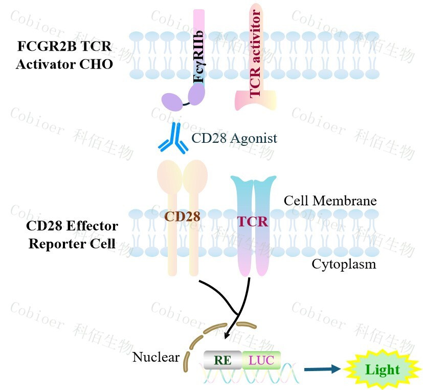 CD28 Effector Reporter Cell 報(bào)告基因藥靶模型很好的模擬了體內(nèi) CD28 的信號(hào)轉(zhuǎn)導(dǎo)過 程,原理見下圖所示。 ![]() Figure 1. CD28 Effector Reporter Cell 細(xì)胞模型原理圖 |