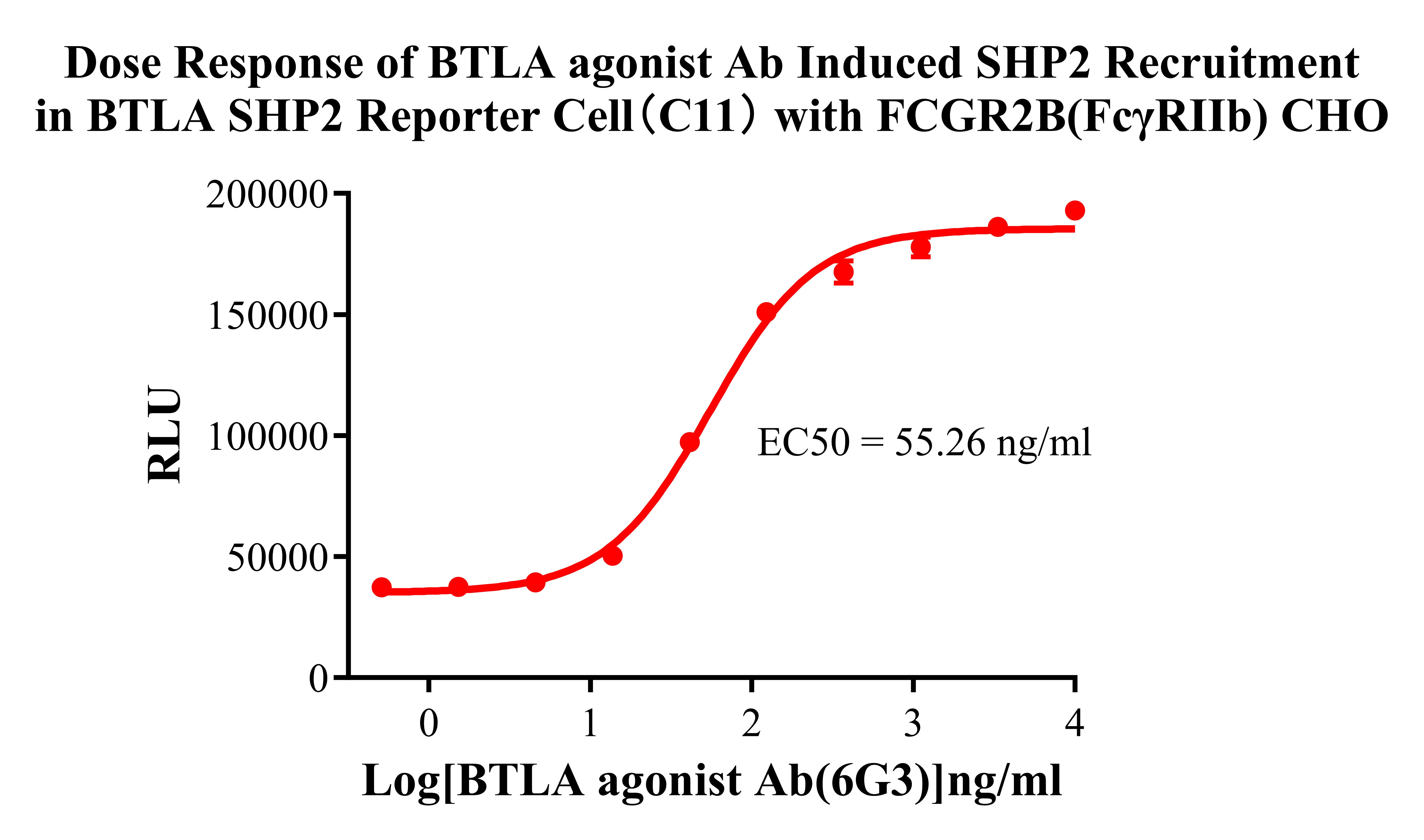 ![]() Figure 3. Dose Response of BTLA agonist Ab Induced SHP2 Recruitment in BTLA SHP2 Reporter Cell(C11) with FCGR2B(FcγRIIb) CHO.