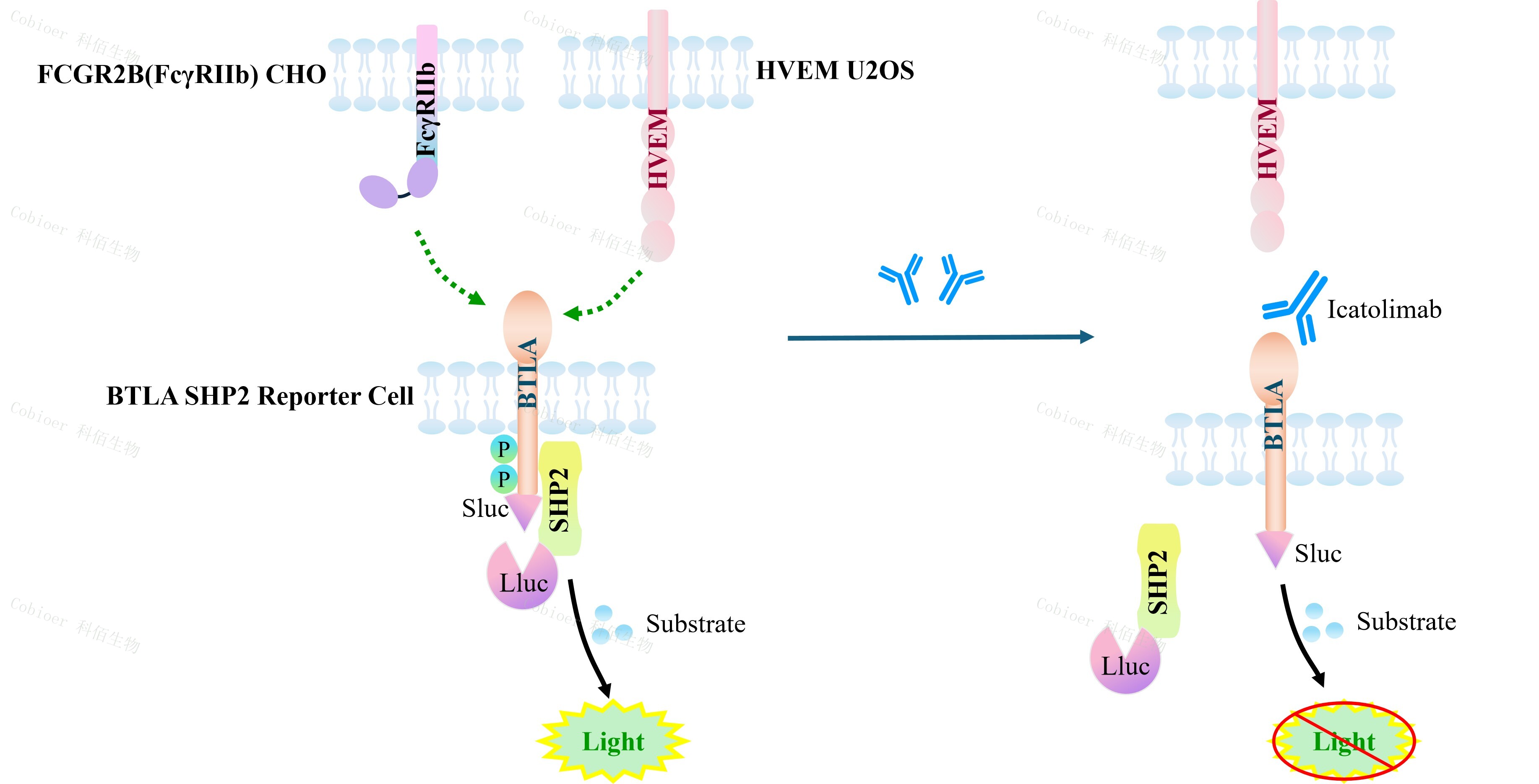 BTLA SHP2 Reporter Cell 報(bào)告基因藥靶模型很好的模擬了體內(nèi) BTLA/SHP2 的信號(hào)轉(zhuǎn)導(dǎo)過(guò)程,原理見下圖所示。![]() Figure 1. BTLA SHP2 Reporter Cell 細(xì)胞模型原理圖 |