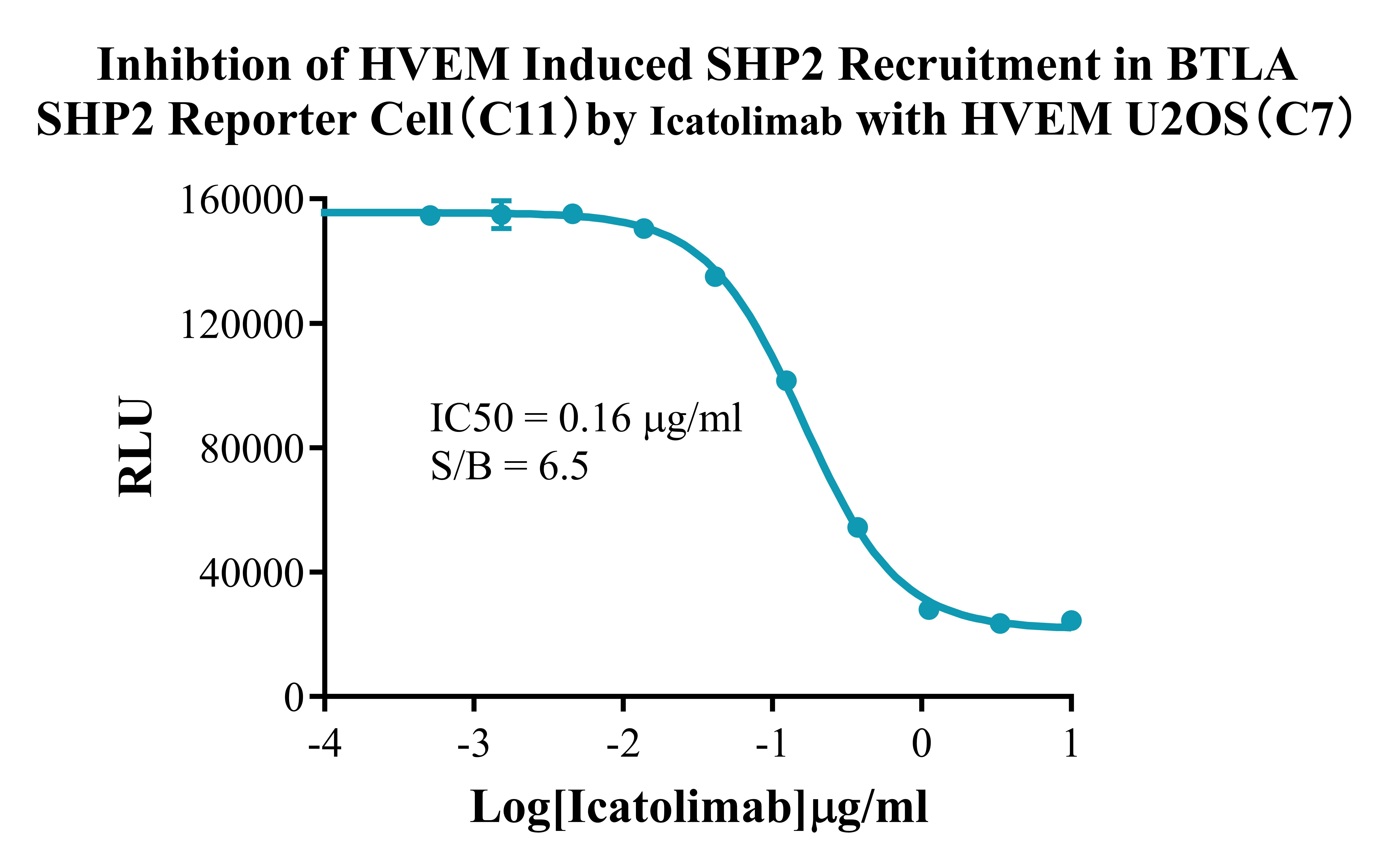 Figure 4. Inhibtion of HVEM Induced SHP2 Recruitment In BTLA SHP2 Reporter Cell(C11) By lcatolimab with HVEM U2OS (C7). |