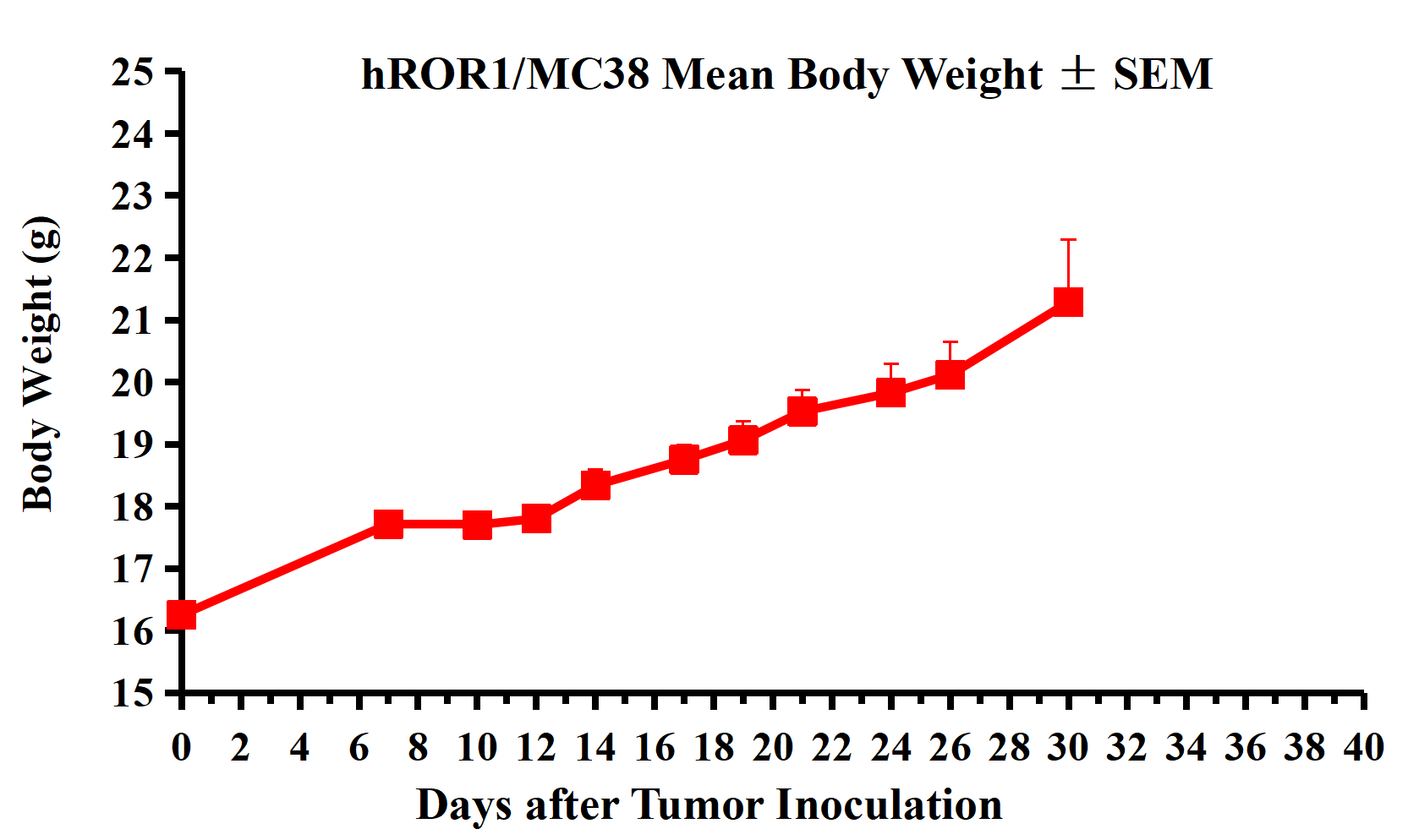 hROR1/MC38 Mean Body Weight ± SEM.