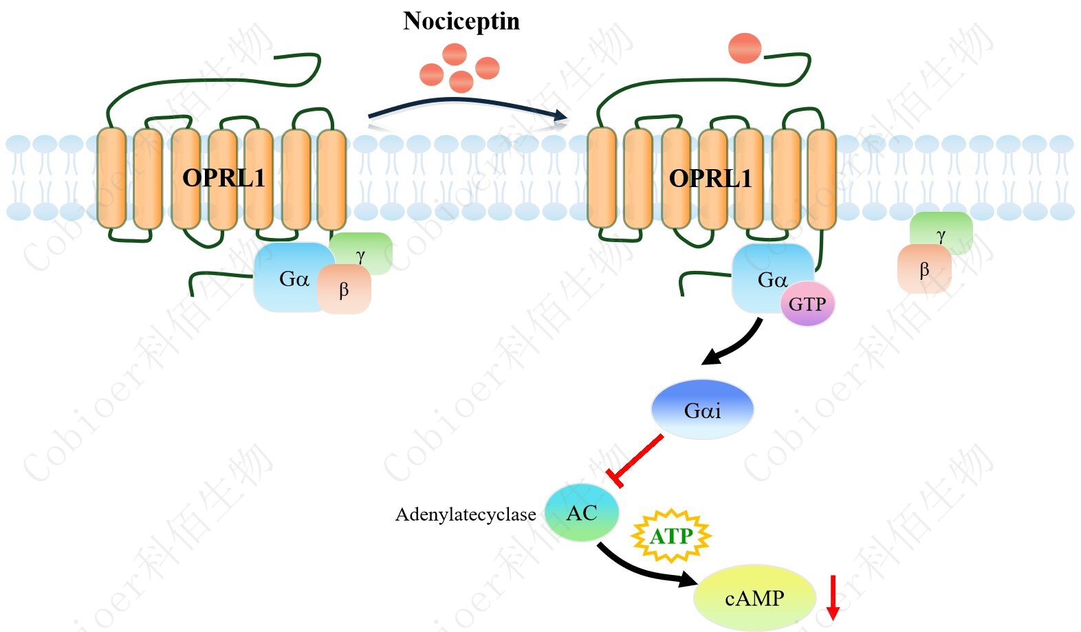 cAMP 在 G 蛋白偶聯(lián)受體(GPCR)信號(hào)轉(zhuǎn)導(dǎo)中是一種關(guān)鍵的第二信使。當(dāng)配體結(jié)合到 GPCR,構(gòu)象發(fā)生變化,激活受體接著激活 G 蛋白,Gi 的激活導(dǎo)致腺苷酸環(huán)化酶調(diào)控 cAMP 的下調(diào)。OPRL1 CHO 藥靶模型很好的模擬了體內(nèi) OPRL1 的信號(hào)轉(zhuǎn)導(dǎo)過程,原理見下圖所示。