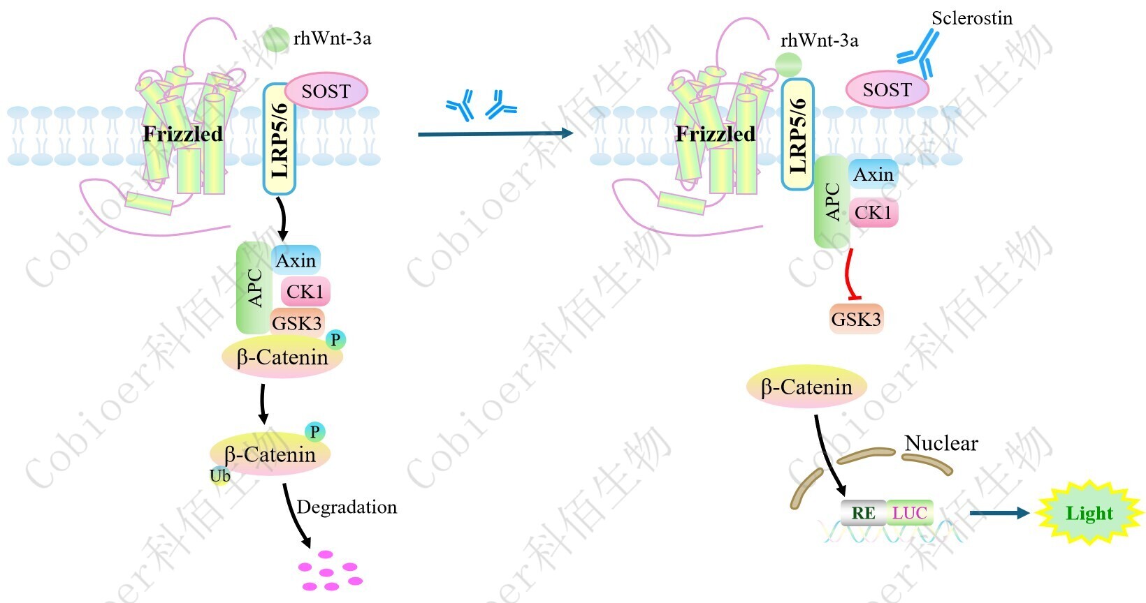 SOST Effector Reporter Cell 報告基因藥靶模型很好的模擬了體內(nèi) WNT 的信號轉(zhuǎn)導(dǎo)過程, 原理見下圖所示。