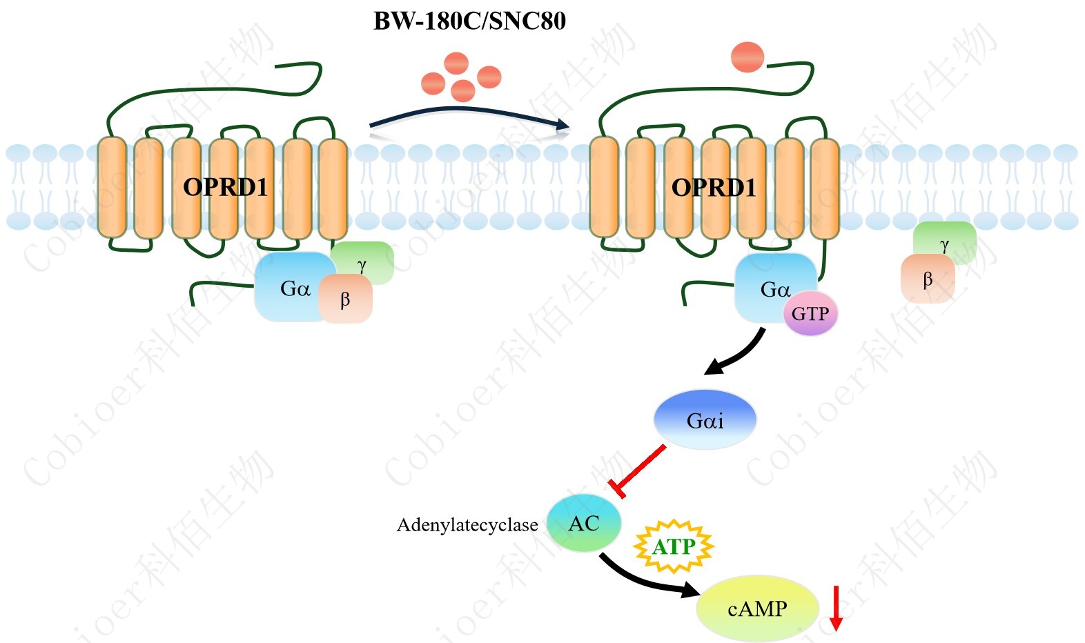 阿片受體家族包括κ-阿片受體(KOP)、 δ-阿片受體(DOP)、µ-阿片受體(MOP) 和痛覺肽阿片受體(NOP),均屬于 G 蛋白偶聯(lián)受體,主要通過偶聯(lián)下游 Gi 蛋白發(fā)揮功 能。OPRD1 是一種 G 蛋白偶聯(lián)受體,作為內源性腦啡肽和其他阿片亞群的受體。配體結合 引起構象改變,通過鳥嘌呤核苷酸結合蛋白(G 蛋白)觸發(fā)信號,并調節(jié)下游效應物(如腺苷 酸環(huán)化酶)的活性。信號傳導導致腺苷酸環(huán)化酶活性的抑制。它通過減少鈣離子電流和增加 鉀離子電導來抑制神經遞質釋放。它在疼痛的感知和阿片介導的鎮(zhèn)痛中起作用。