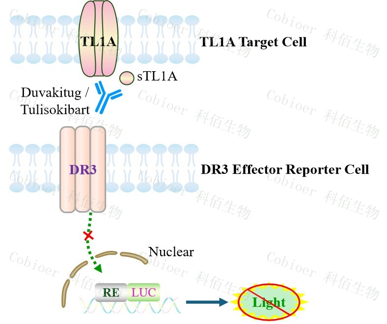 TL1A Target Cell 作為 DR3 Effector Reporter Cell 的靶細(xì)胞,很好的模擬了體內(nèi) DR3 的 信號(hào)轉(zhuǎn)導(dǎo)過(guò)程,原理見下圖所示。