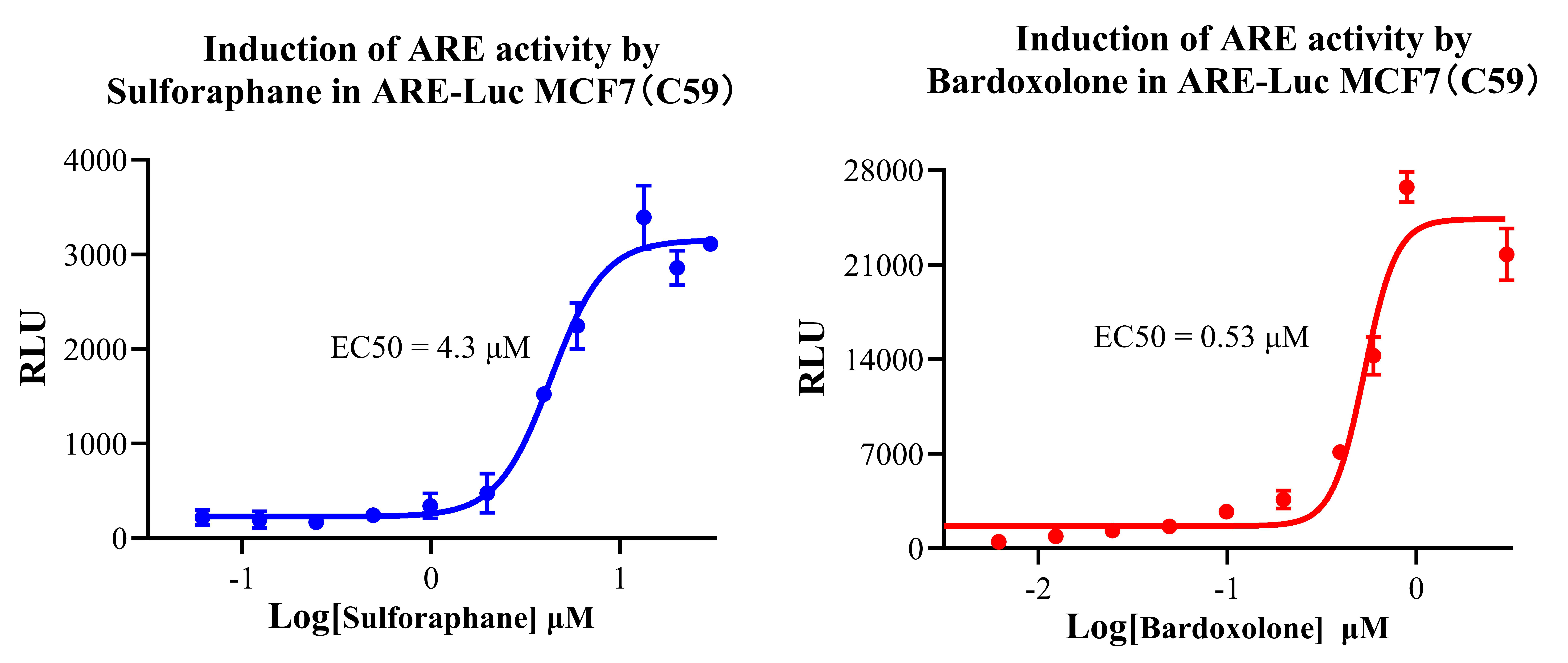Figure 2. Induction of ARE activity by Sulforaphane in ARE-Luc MCF7(C59). Induction of ARE activity by Bardoxolone in ARE-Luc MCF7(C59).