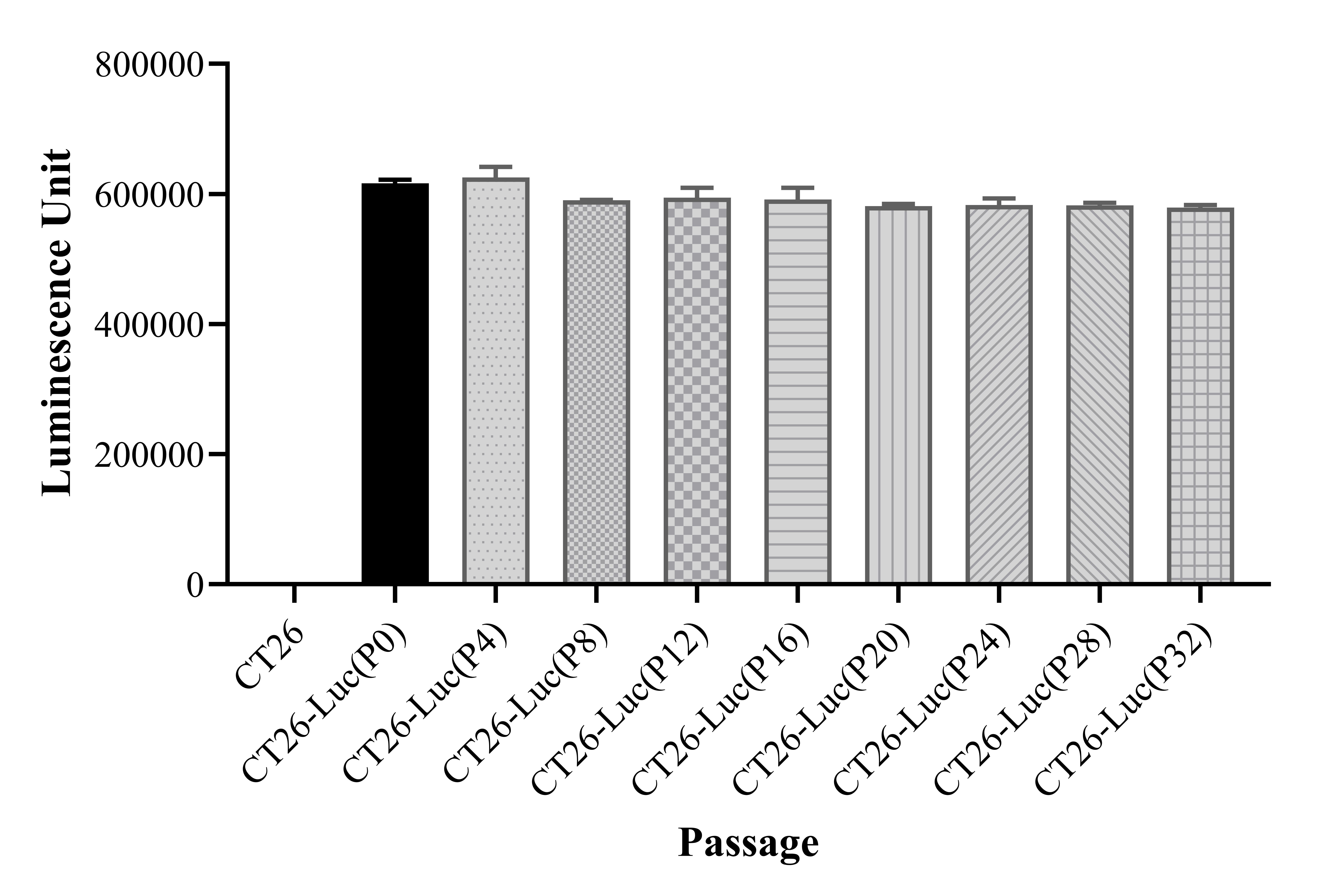 Figure 1. Stablity test results. CT26-Luc showed at least 32 passage stability with similar luminescence unit.