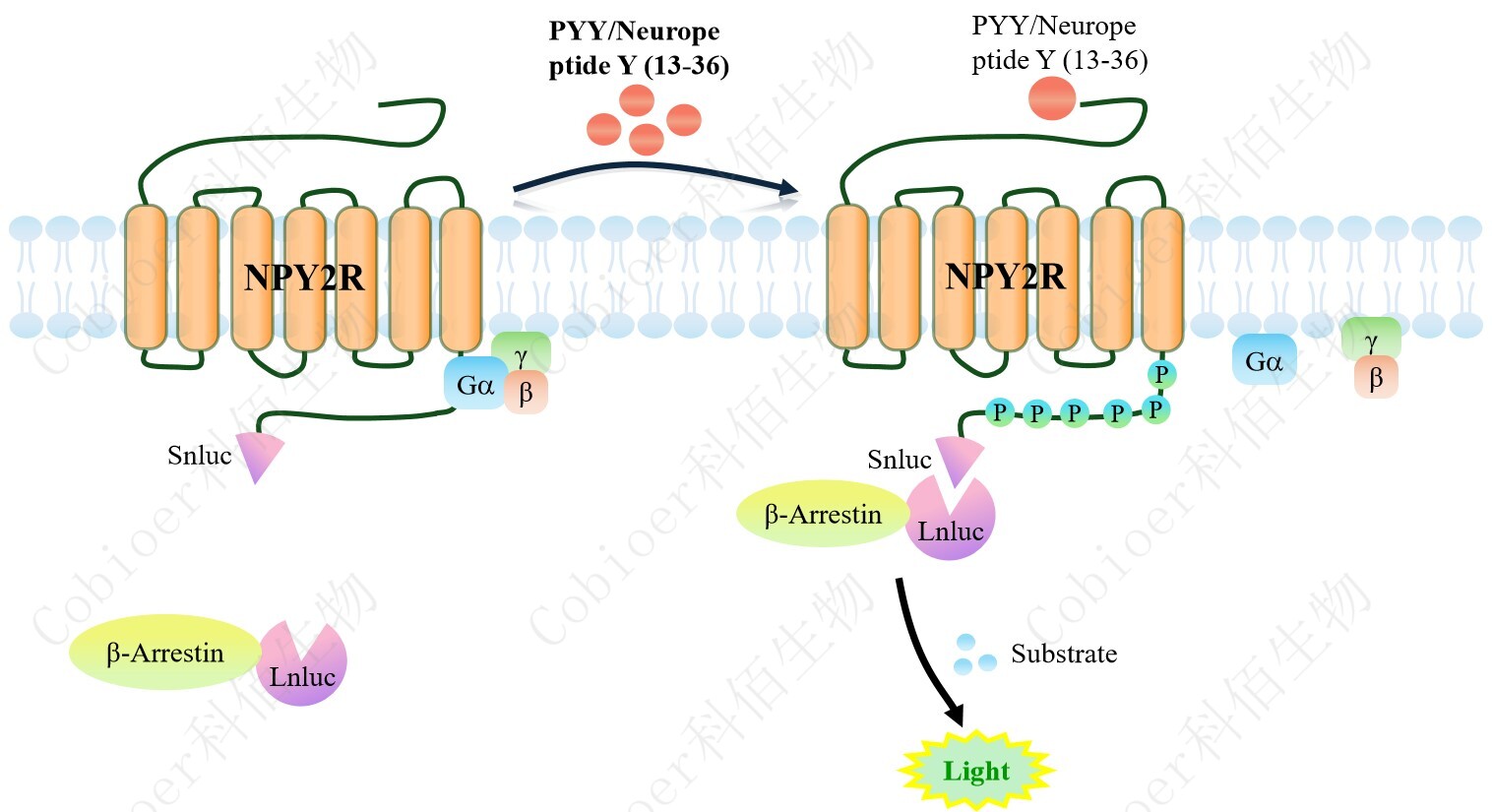 NPY2R β-Arrestin CHO 報告基因藥靶模型很好的模擬了體內(nèi) NPY2R/β-Arrestin 的信號 轉導過程,原理見下圖所示。當缺乏配體刺激時,β-Arrestin 不與 NPY2R 結合,融合β- Arrestin 的熒光素酶處于失活構象,當 NPY2R 遭遇配體刺激時,融合熒光素酶報告基因的β-Arrestin 被招募,使熒光素酶報告基因處于激活狀態(tài),加入其底物后發(fā)光信號增強。