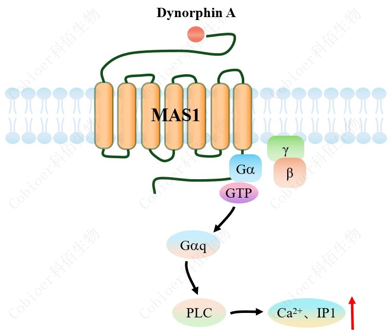 MAS1 可以通過 Gq 蛋白的信號通路,調(diào)控 IP1 的升高。MAS1 與配體結(jié)合,導致 Gαq 亞基的激活,觸發(fā) PLC-γ,從而產(chǎn)生兩個第二信使:IP3 和 DAG,它們參與細胞內(nèi)鈣動員。 由于 IP3 在代謝上不穩(wěn)定,因此測量通路激活的替代標志物 IP1 作為檢測標準。