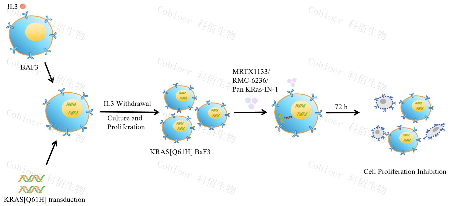 BaF3(小鼠原 B 細胞)的生長和增殖需要 IL-3 的維持。通過引入各種表達激酶的基因, 能作為 BaF3 的驅(qū)動基因,讓 BaF3 不再依賴 IL-3 而增殖,進而激酶基因成為 BaF3 增殖依 賴的驅(qū)動基因,用于評估小分子藥物對激酶的靶向抑制作用,原理及流程見下圖所示。