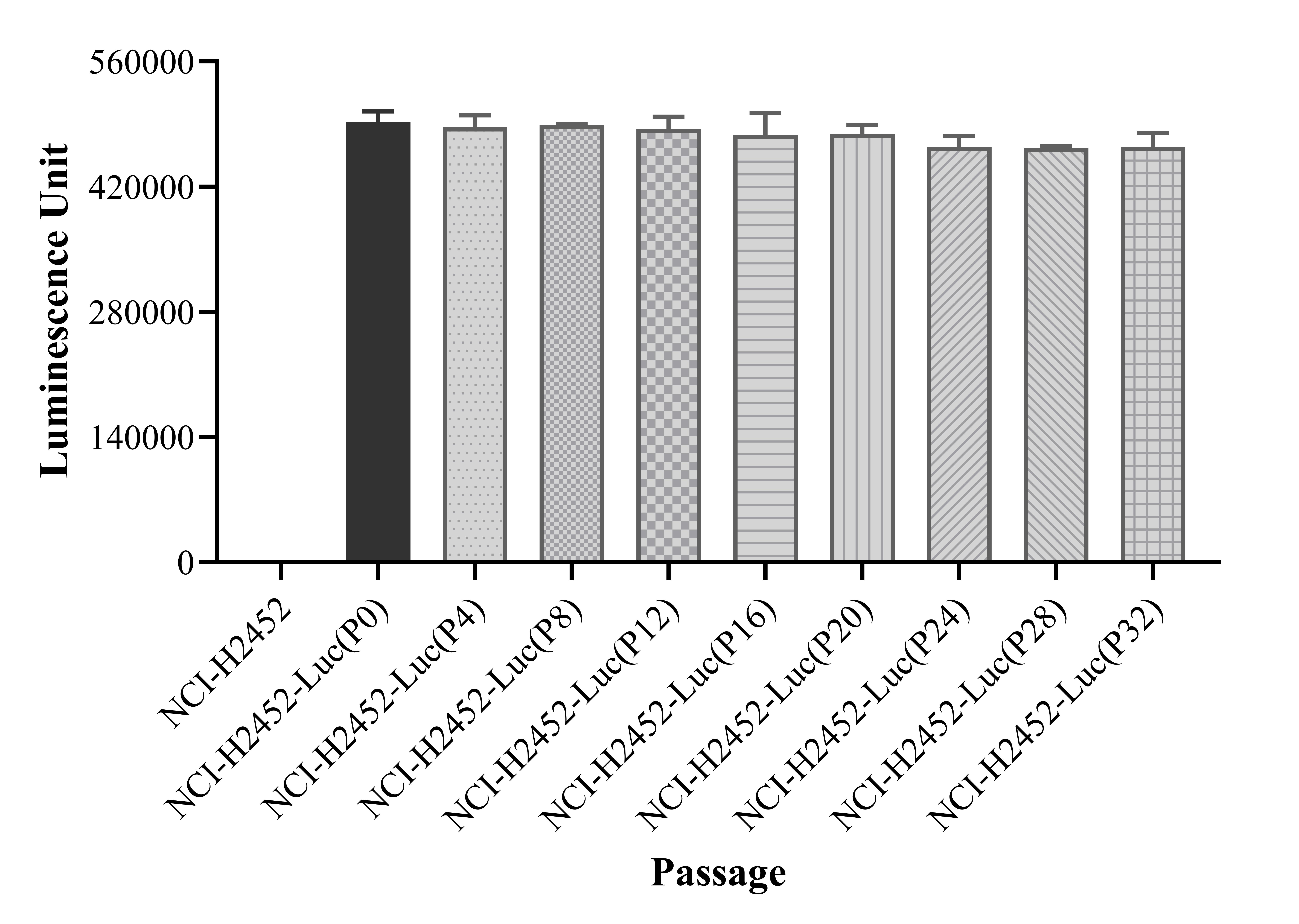 Figure 1. Stablity test results. NCI-H2452-Luc showed at least 32 passage stability with similar luminescence unit. |