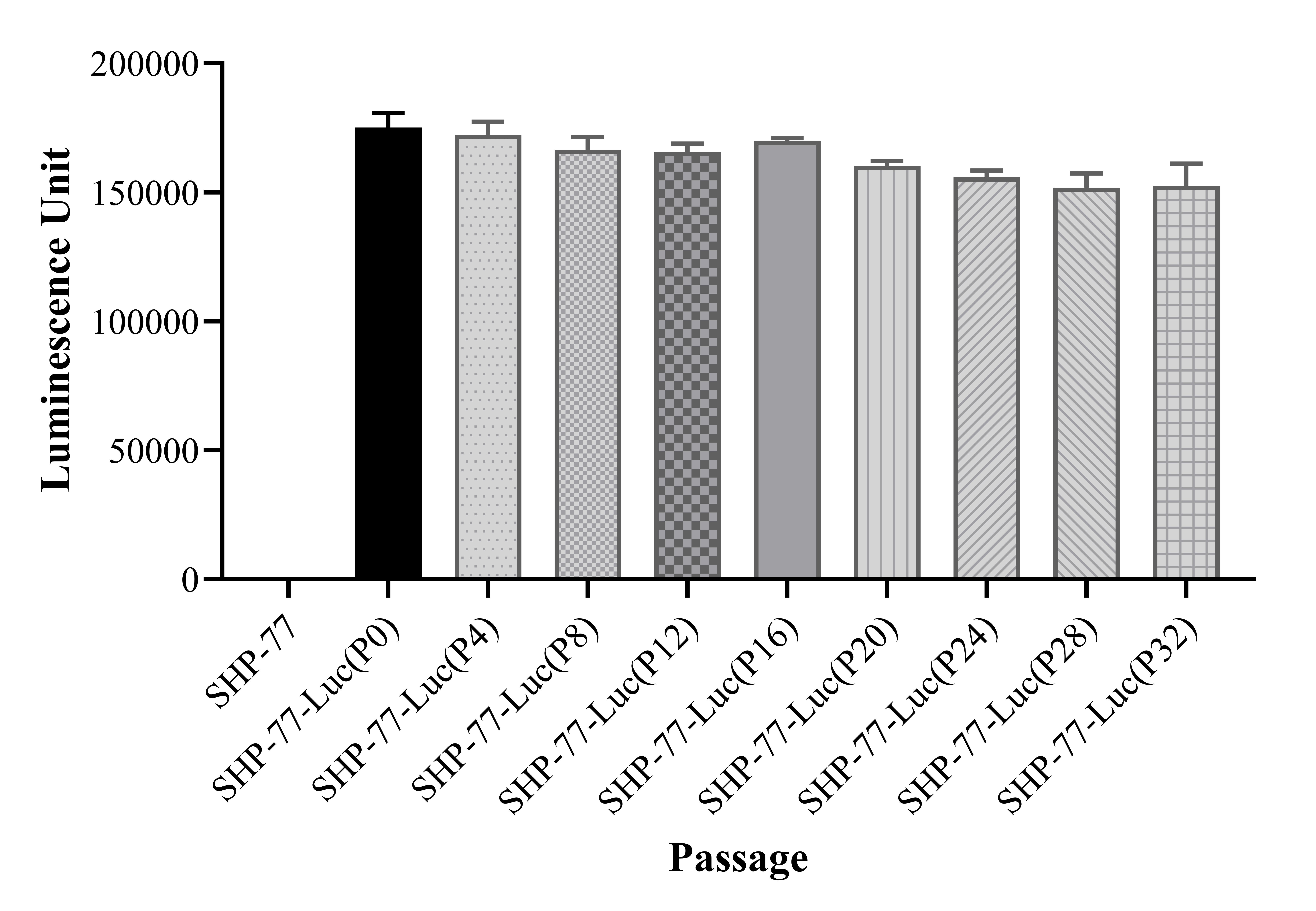 Figure 1. Stablity test results. SHP-77-Luc showed at least 32 passage stability with similar luminescence unit. |